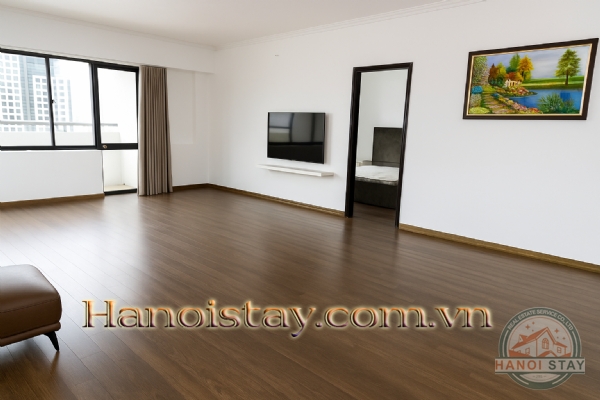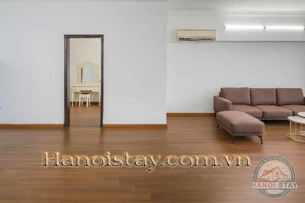 Discover this expansive 4-bedroom, 2 -bathroom apartment for rent in the heart of Lang Ha Street, Dong Da District, spanning a generous 200sqm. Perfect for large families or professionals needing ample space, this Hanoi apartment rental offers a sophisticated living experience. The bright living area features a modern sectional sofa, a large coffee table, and floor-to-ceiling windows with elegant blinds, creating a welcoming atmosphere with hardwood flooring throughout.