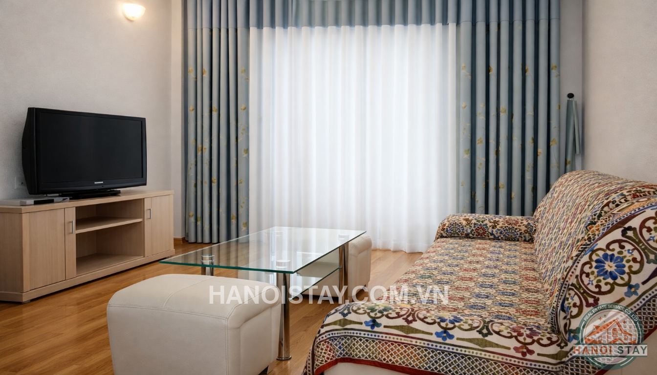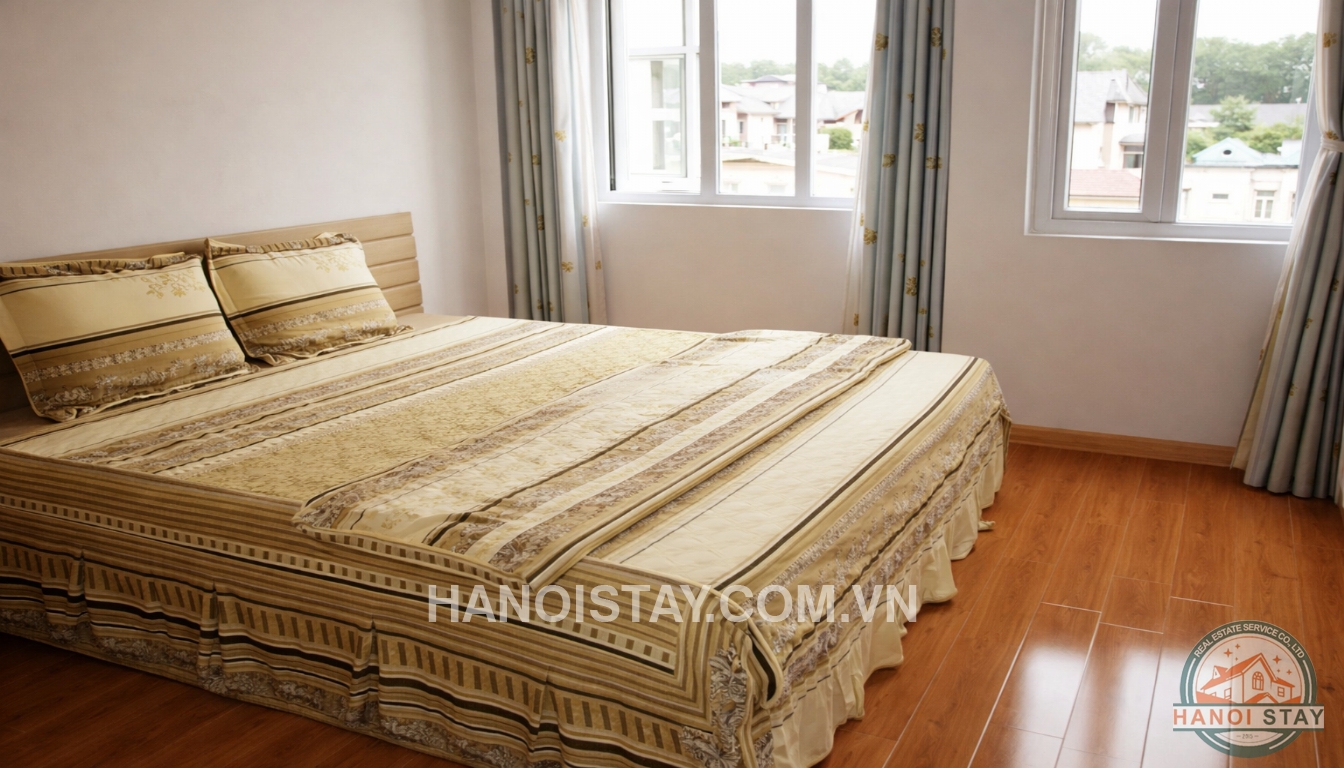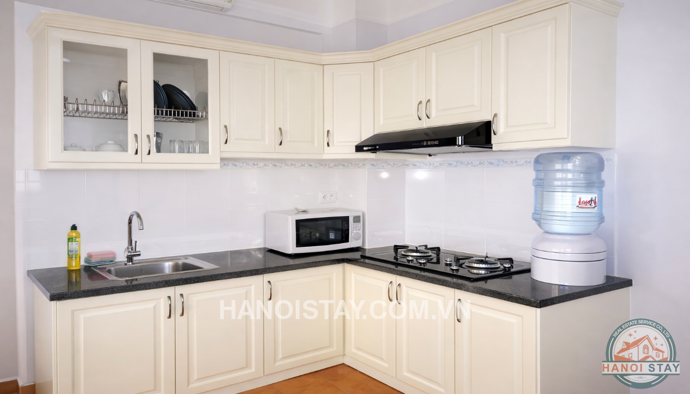 With an usable area of 60 sqm, the apartment is designed a living room with a a leather sofa, coffee table, an LCD TV, a functional kitchen with kitchen cabinet, big fridge, microwave, a set of dining table with 4 chairs, the separated bedroom with Queen size bed, wardrobe, bed stuff, full bathroom with walkin shower, basin, toilet, green view from the bedroom.