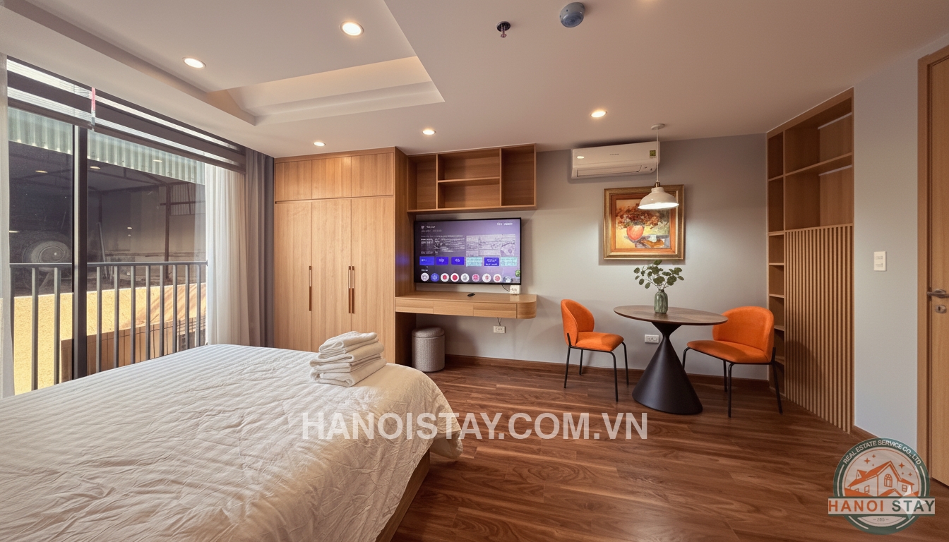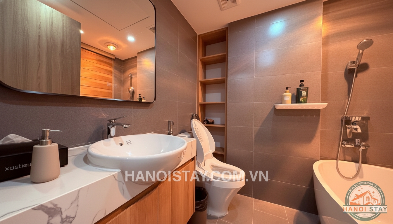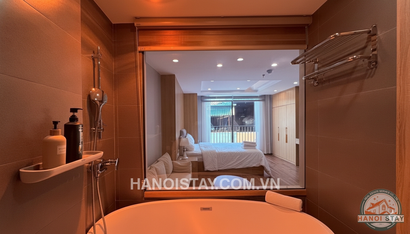 ✨ WHY YOU WILL LOVE THIS RESIDENCE?Exquisite Design: Warm wood tones, elegant paneling, and a clever open-plan layout that feels incredibly spacious and cozy.The "Spa" Experience: Featuring a premium, free-standing bathtub with a unique glass-wall view into the bedroom—perfect for unwinding after a long day. Includes a Japanese smart toilet and high-end fixtures.Sun-Drenched Living: Floor-to-ceiling windows and a private balcony flood the room with natural light.Chef’s Corner: A modern, L-shaped kitchen with marble backsplashes, induction stove, and plenty of storage.Prime Location: Steps away from Lotte Center, Vincom Metropolis, and the best Japanese dining area (Linh Lang/Kim Ma).🌿 PROPERTY HIGHLIGHTS:Size: ~45 $m^2$ Studio.Condition: 100% Brand New & Pristine.Furniture: Fully furnished with a king-size bed, smart TV, AC, and high-quality appliances.Security: 24/7 security, fingerprint access, and professional management.🏢 SERVICES INCLUDED:High-speed Fiber Wi-Fi & Cable TV.Professional cleaning service (2-3 times/week).Tap water & secure motorbike parking.Laundry & bedding changes.