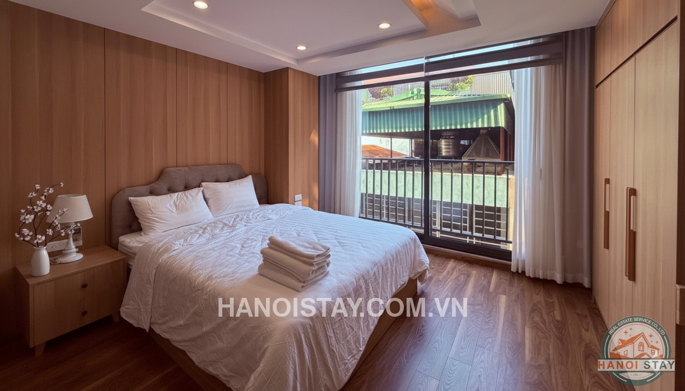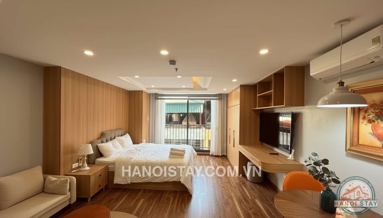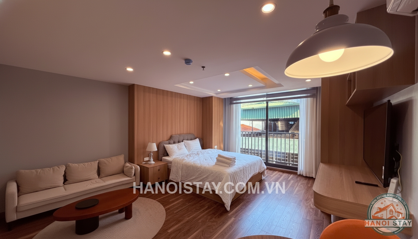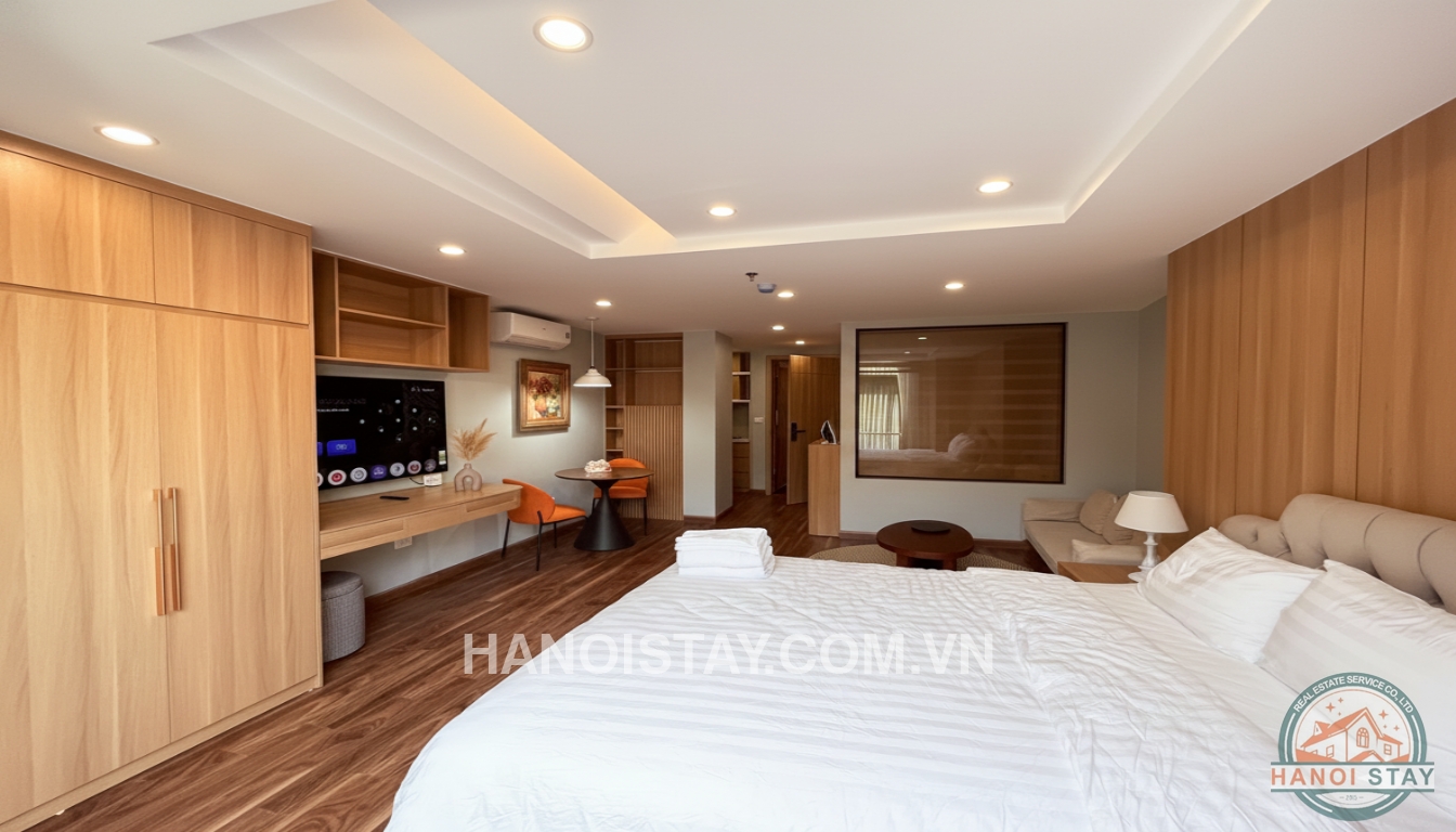 ✨ WHY YOU WILL LOVE THIS RESIDENCE?Exquisite Design: Warm wood tones, elegant paneling, and a clever open-plan layout that feels incredibly spacious and cozy.The "Spa" Experience: Featuring a premium, free-standing bathtub with a unique glass-wall view into the bedroom—perfect for unwinding after a long day. Includes a Japanese smart toilet and high-end fixtures.Sun-Drenched Living: Floor-to-ceiling windows and a private balcony flood the room with natural light.Chef’s Corner: A modern, L-shaped kitchen with marble backsplashes, induction stove, and plenty of storage.Prime Location: Steps away from Lotte Center, Vincom Metropolis, and the best Japanese dining area (Linh Lang/Kim Ma).🌿 PROPERTY HIGHLIGHTS:Size: ~45 $m^2$ Studio.Condition: 100% Brand New & Pristine.Furniture: Fully furnished with a king-size bed, smart TV, AC, and high-quality appliances.Security: 24/7 security, fingerprint access, and professional management.🏢 SERVICES INCLUDED:High-speed Fiber Wi-Fi & Cable TV.Professional cleaning service (2-3 times/week).Tap water & secure motorbike parking.Laundry & bedding changes.