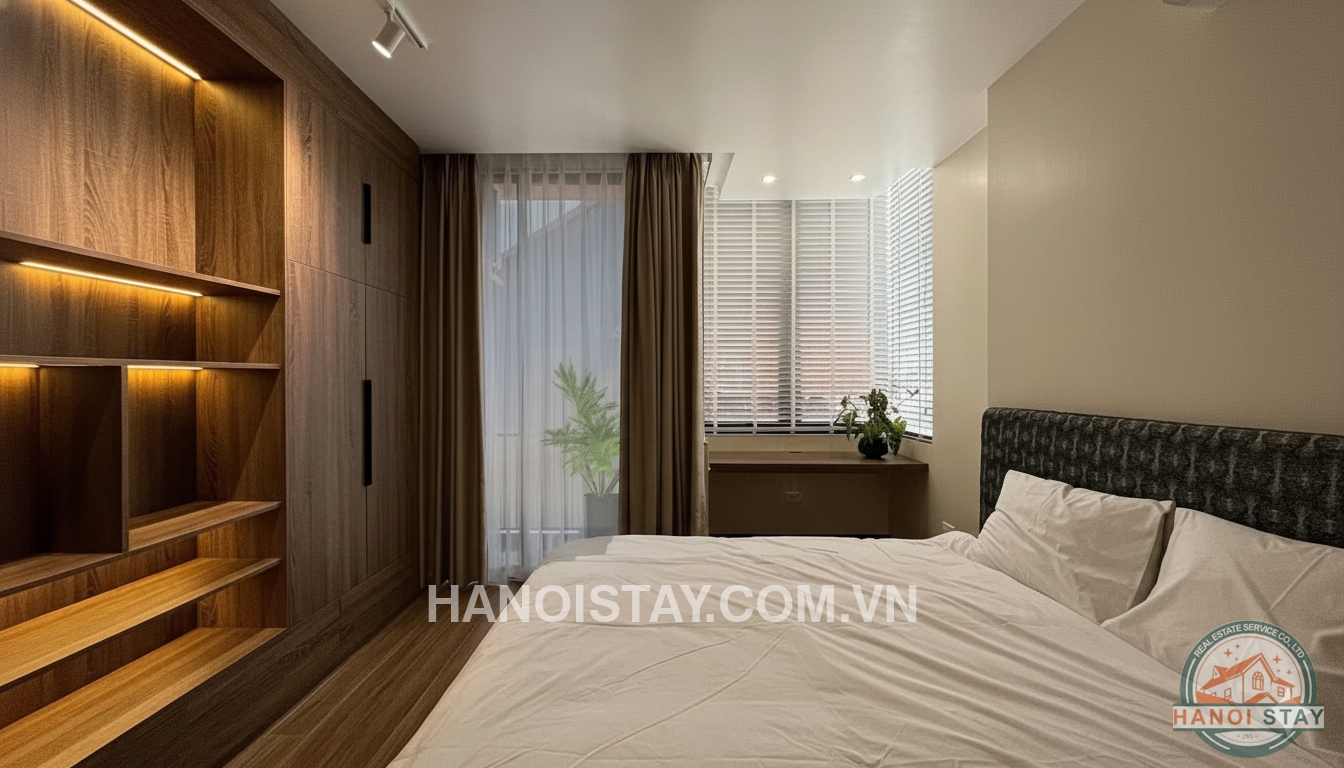 Spacious bedroom with king-size bed, wardrobe, and blackout curtains