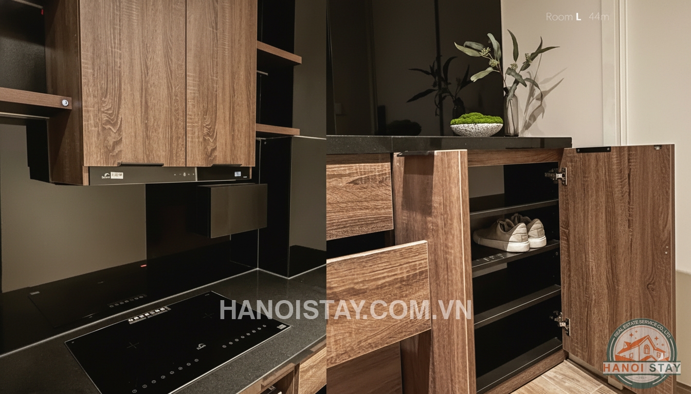 Fully equipped kitchen: induction stove, fridge, microwave, hood, and cooking utensils