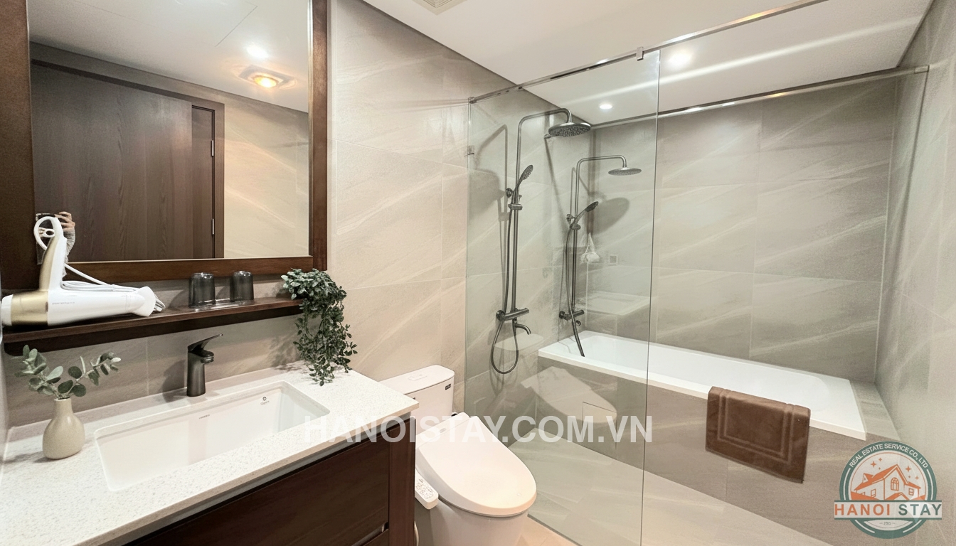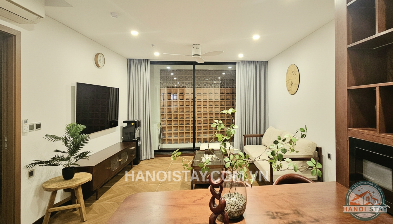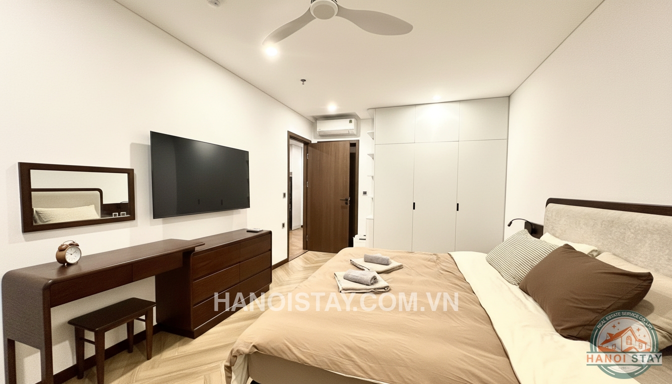 This high-end 1-bedroom (1BR) serviced apartment is located in the prime, central area of Lieu Giai, Ba Dinh. The unit is designed in a modern style, utilizing a sophisticated color palette of white and dark wood tones to create an elegant, cozy, and refined living experience.