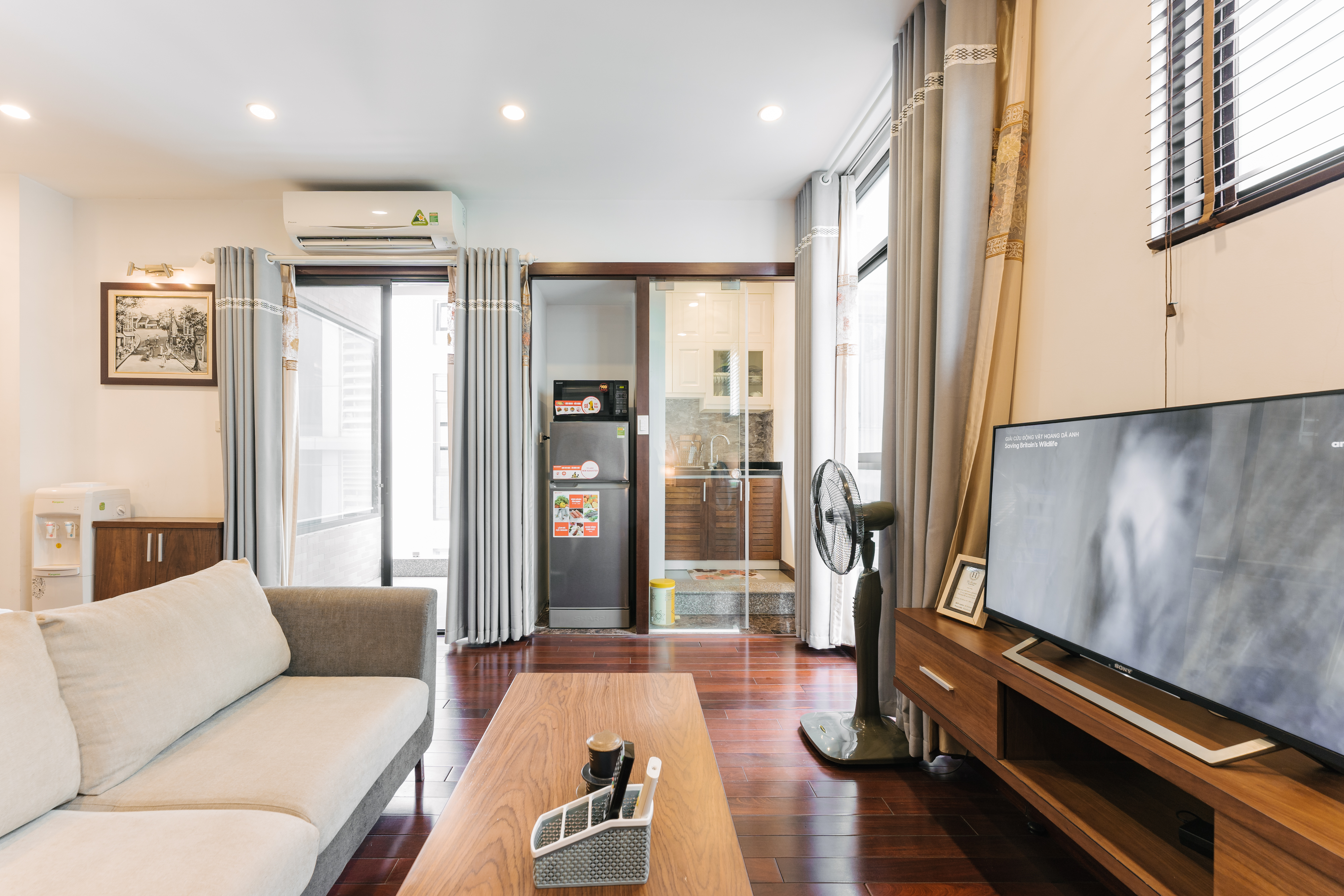 • Open living room with sofa, TV, dining area