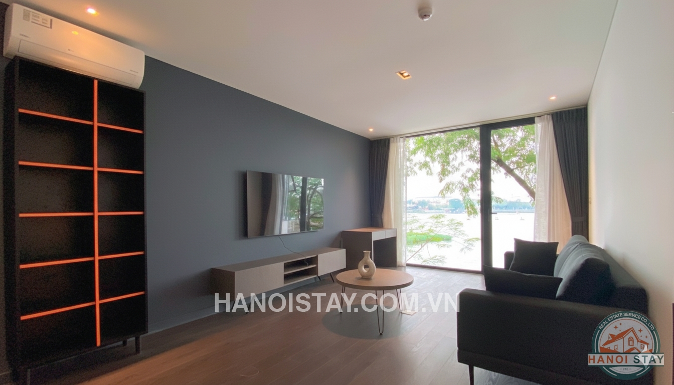 Living Space: The main living and communal area features large, floor-to-ceiling glass doors, opening up to a direct, uninterrupted view of the lake. The furniture uses contemporary dark tones (black sofa, dark gray media console) creating a chic contrast against the white walls.