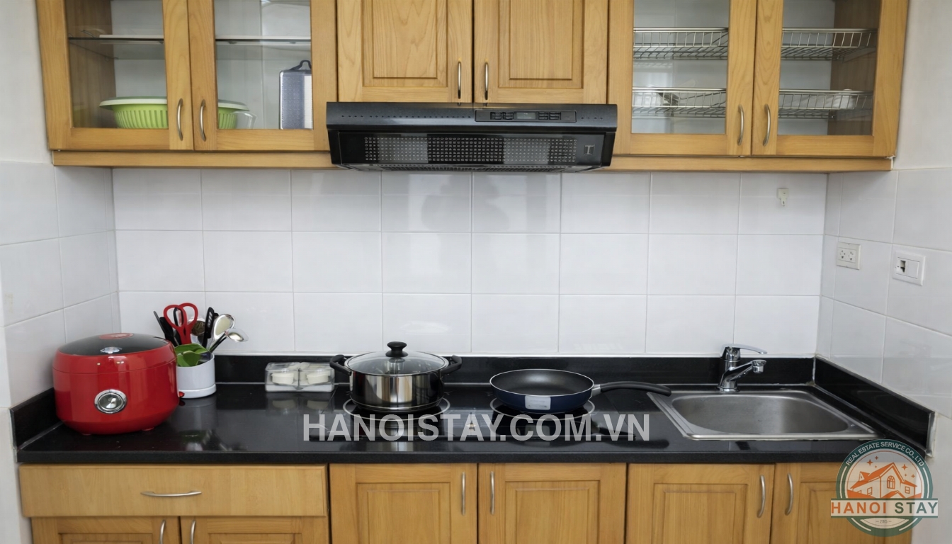 With an usable area of 40 Sqm, the apartment is designed an open floor plan with soft sofa, coffee table, LCD TV with TV shelf, bright window, wooden floor, a Queen size bed with bedding, wooden cabinet, a set of dining table with two chairs, functional kitchen with two level kitchen cabinet, big fridge, cooking utensils, micro wave... a Full bathroom with bathtub shower, basin, toilet...