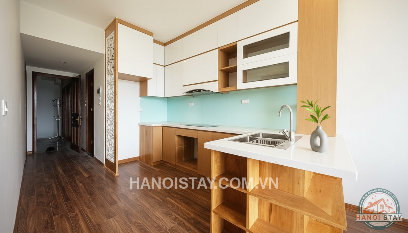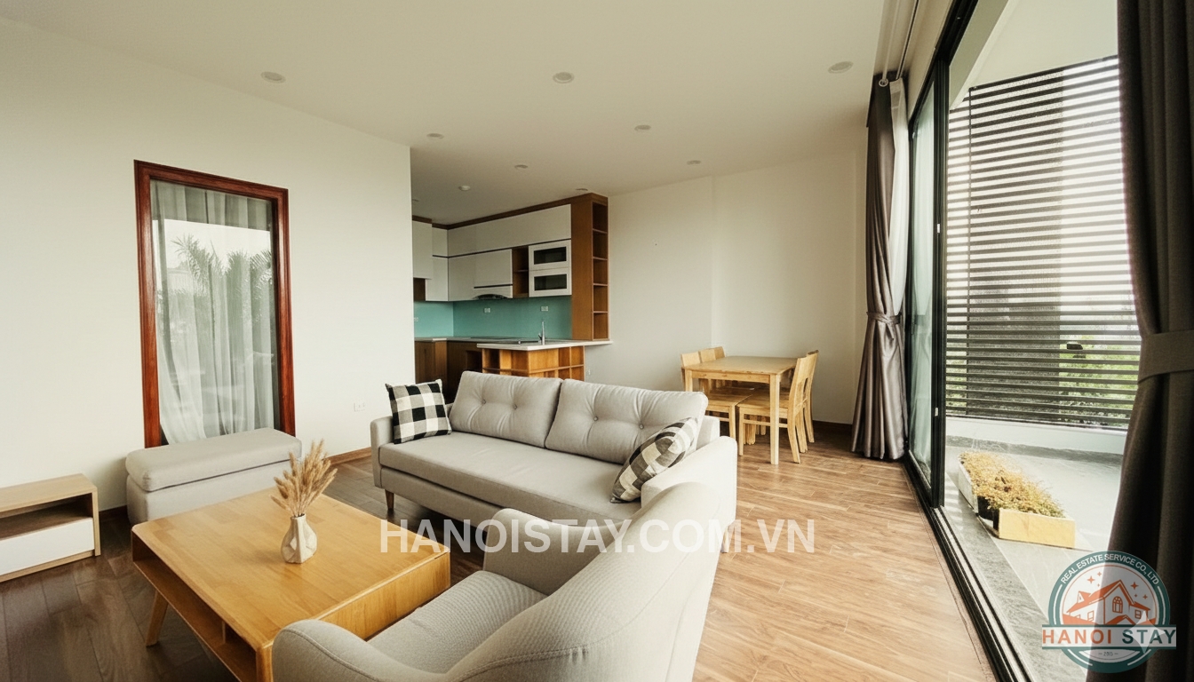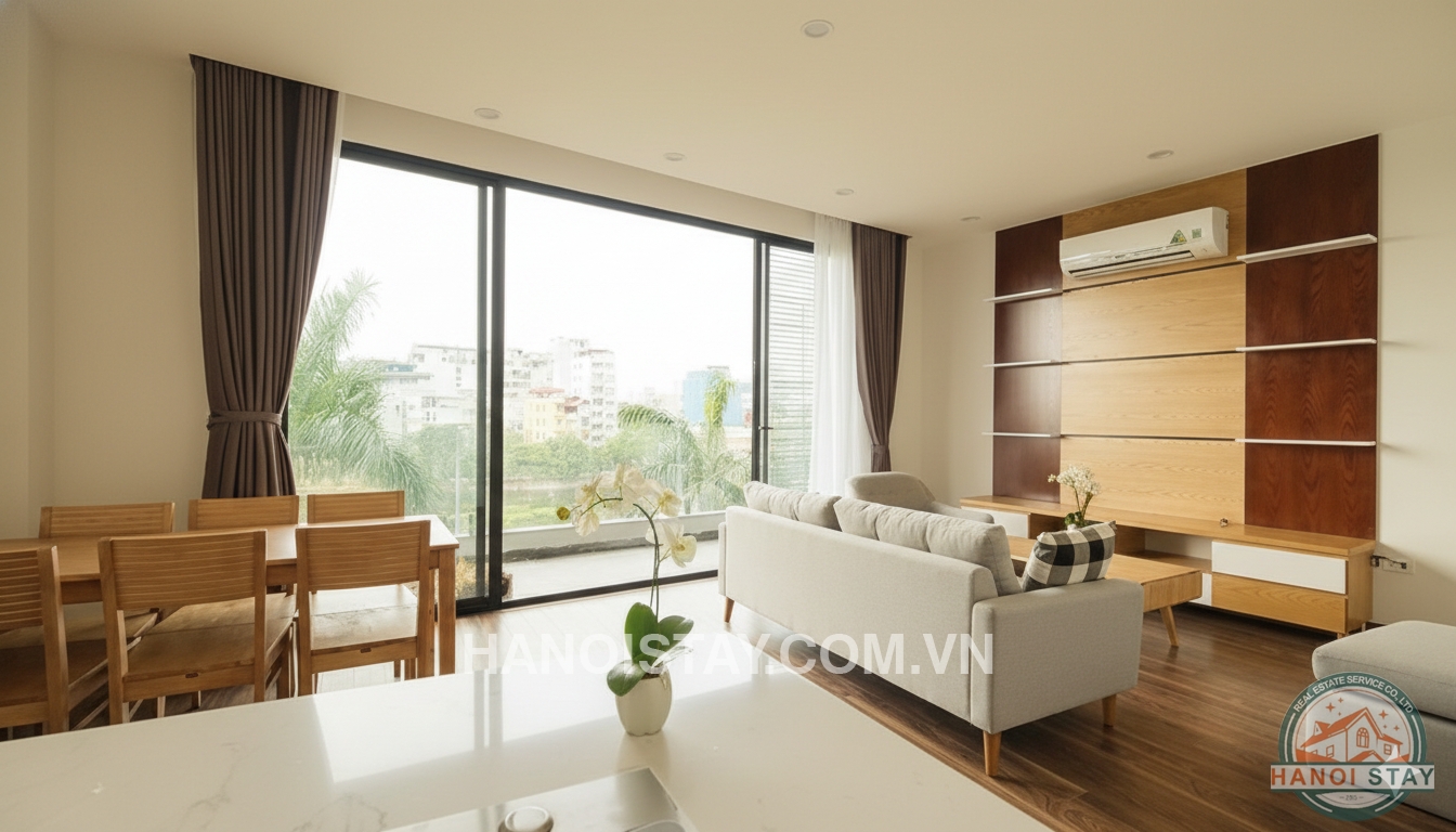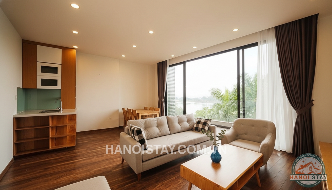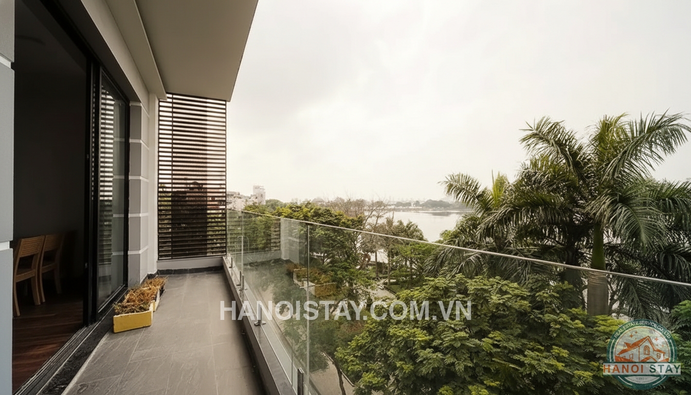 This apartment is perfectly located on Tran Vu, Truc Bach area which offers very nice neighbors and coffees nearby. The apartment has modern style, comprises a living-room, basic kitchen, two bedrooms and two bathrooms. The living-room is quite bright, designed with floor to ceiling windows and leading to big balcony offering a beautiful view of the lake