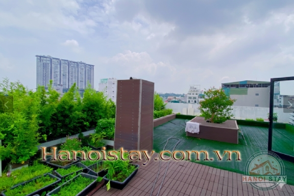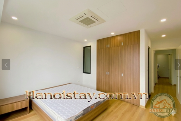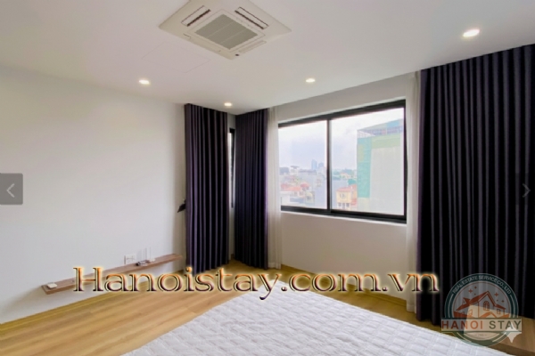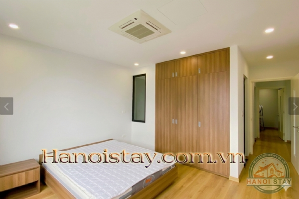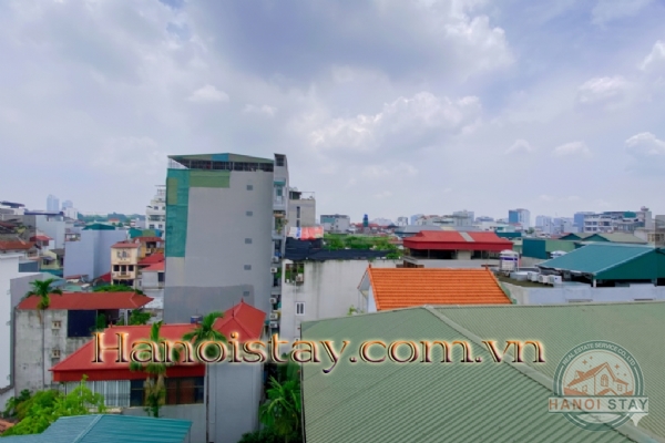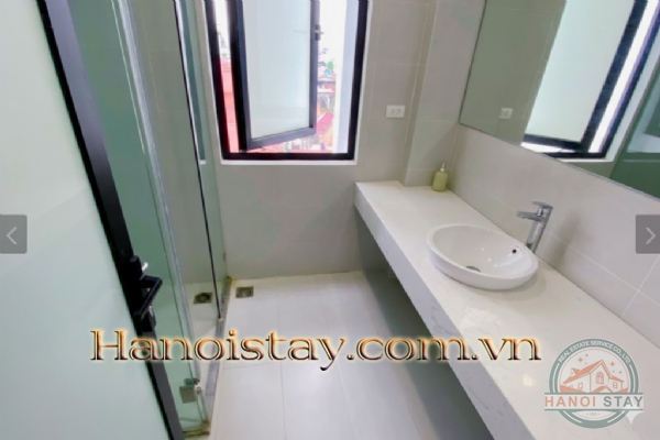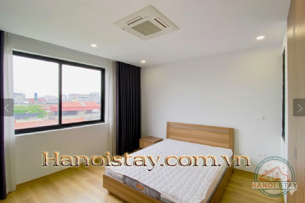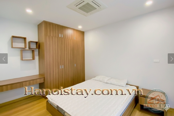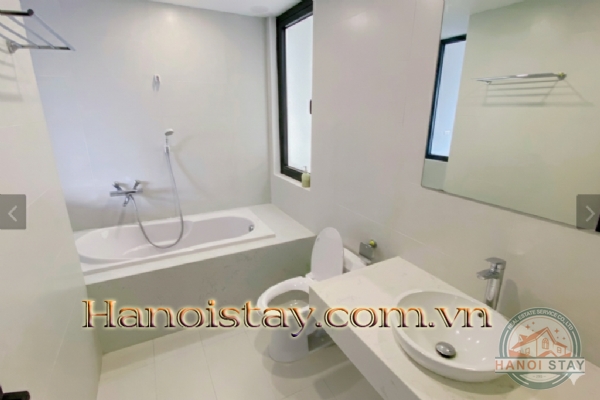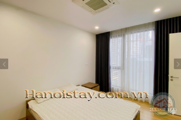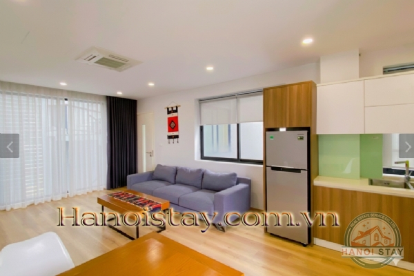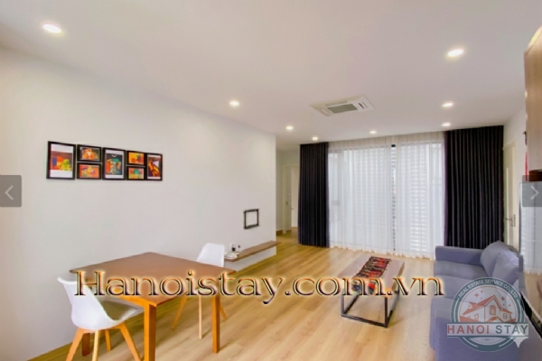 This is a modern two-bedroom, two-bathroom apartment located on Doi Can street. The open-plan living and kitchen area is spacious and bright, featuring a comfortable grey sofa, a wooden coffee table, and a decorative textile hanging on the wall. The kitchen is well-equipped with a large fridge, a built-in microwave, and a washing machine. A dining table with two chairs sits next to a large window, offering plenty of natural light.