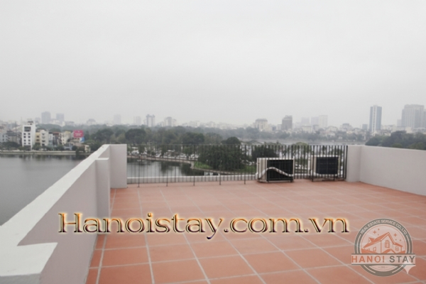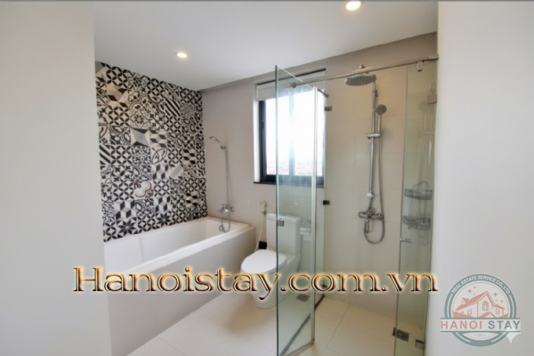 Experience the epitome of modern living with this exquisite 3-bedroom lake view apartment for rent in the serene Ba Mau area of Hanoi. This residence blends sophisticated design with breathtaking natural beauty. The spacious bedroom features a plush bed, a stylish red and gray headboard, and a wall-mounted flat-screen TV. The living area is adorned with a cozy sofa, a wooden coffee table, and a dining space with a large table and benches, perfect for gatherings. The modern kitchen comes equipped with a refrigerator, oven, microwave, and sleek black countertops, catering to all your cooking desires. Floor-to-ceiling windows and sliding glass doors offer stunning lake vistas and abundant natural light. Additional amenities include air conditioning, a ceiling fan, and a picturesque balcony with patterned tiles and greenery. Enjoy a tranquil retreat in a prime location, steps away from Hanoi’s top attractions.