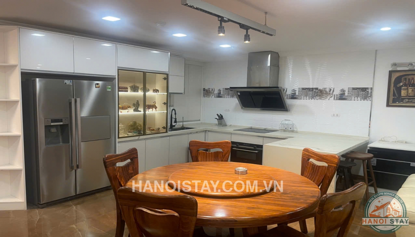 Bright living room, open kitchen, and dining area suitable for expats and small families searching for an apartment for rent in Hanoi.
