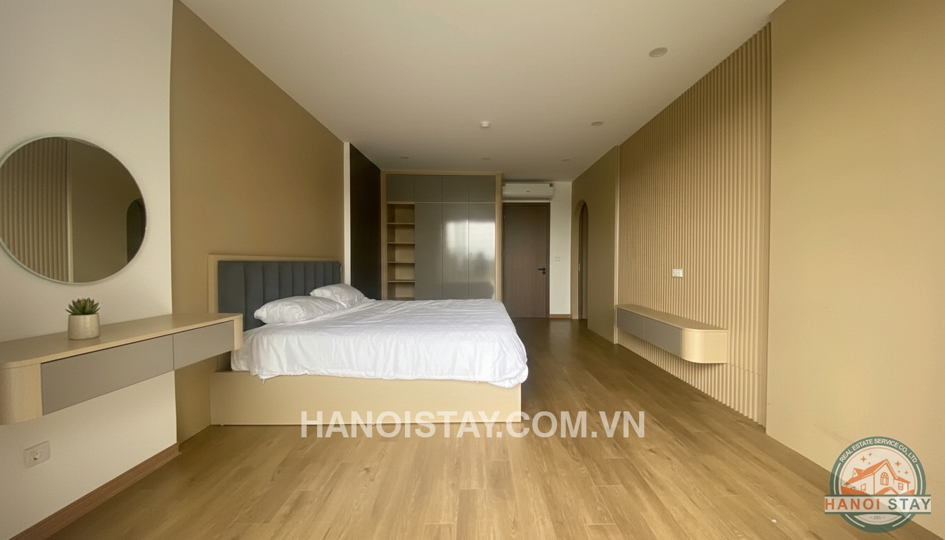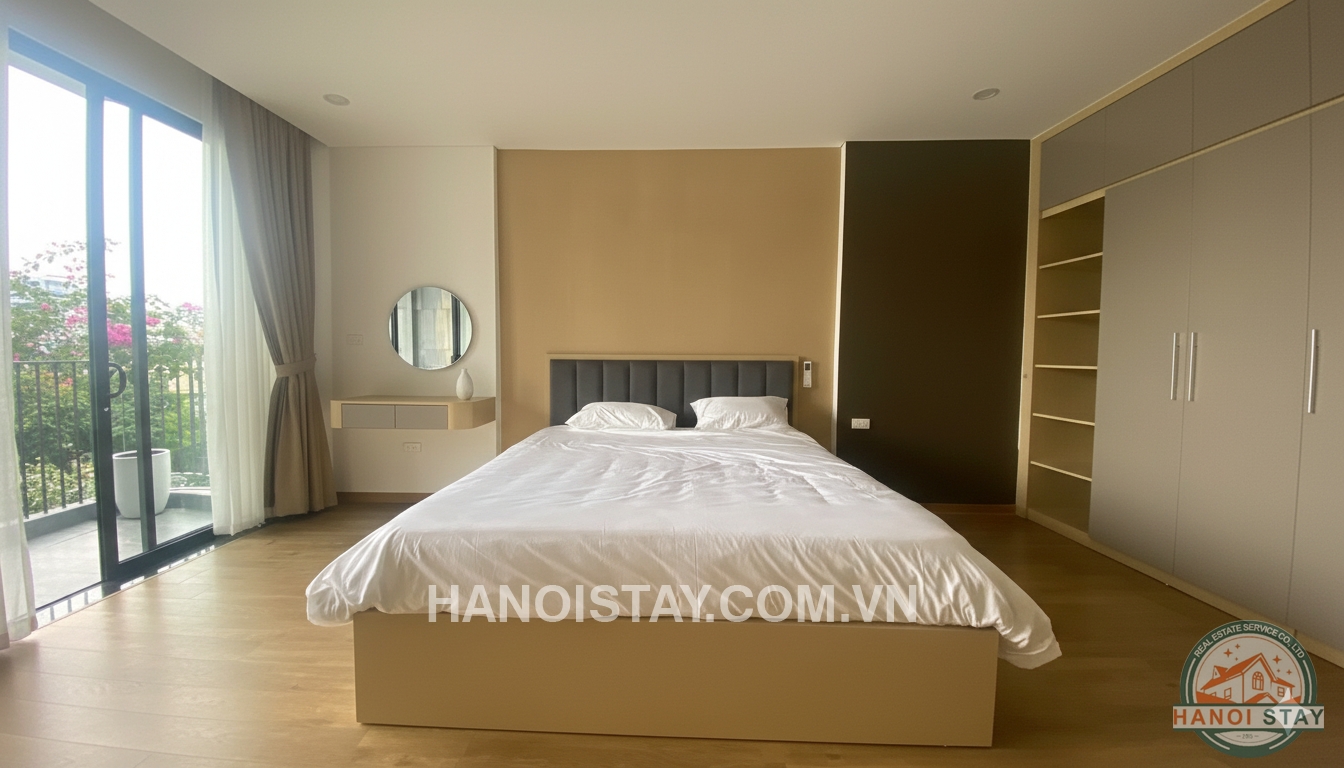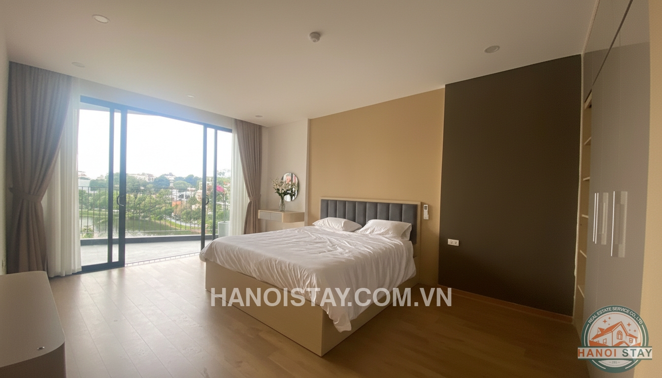 Lake View Apartment in Tay Ho is a bright, modern 1‑bedroom home with full high‑quality furniture and an impressive view of West Lake. The apartment features a spacious bedroom with a large bed, upholstered headboard, bedside tables and a built‑in wardrobe, all in soft neutral tones that create a calm, cozy sleeping space. Floor‑to‑ceiling sliding glass doors open from the bedroom to a generous private balcony with glass and metal railing, bringing in abundant natural light and offering open views of the lake, greenery and the Tay Ho skyline.