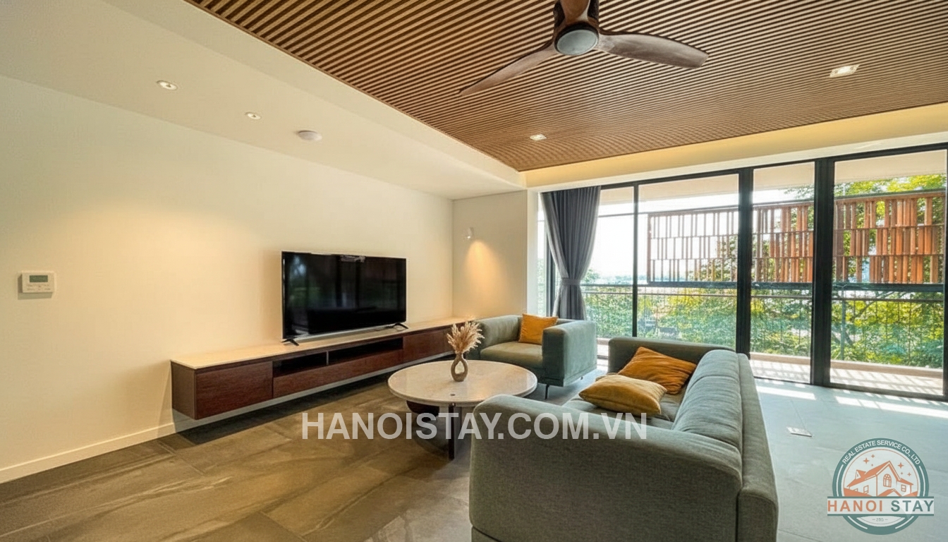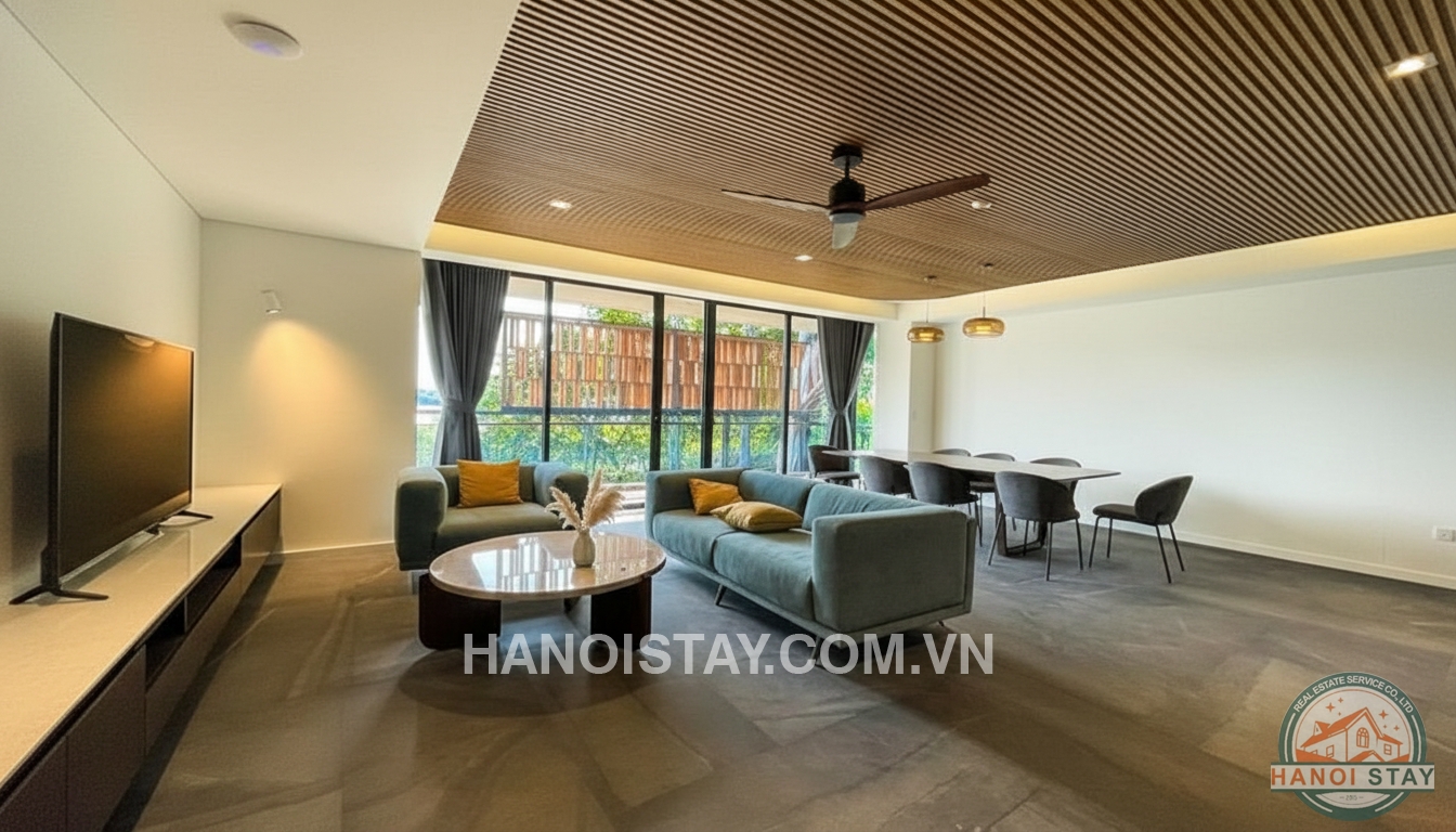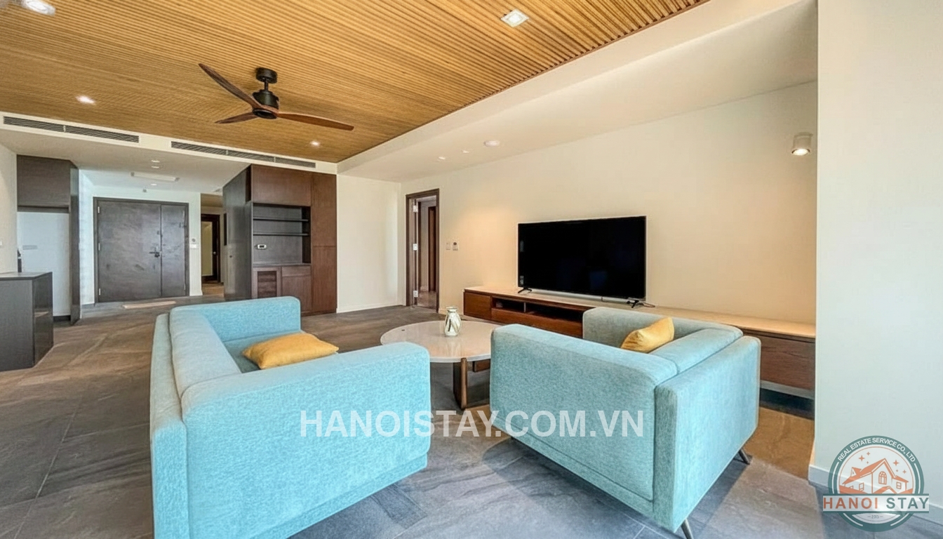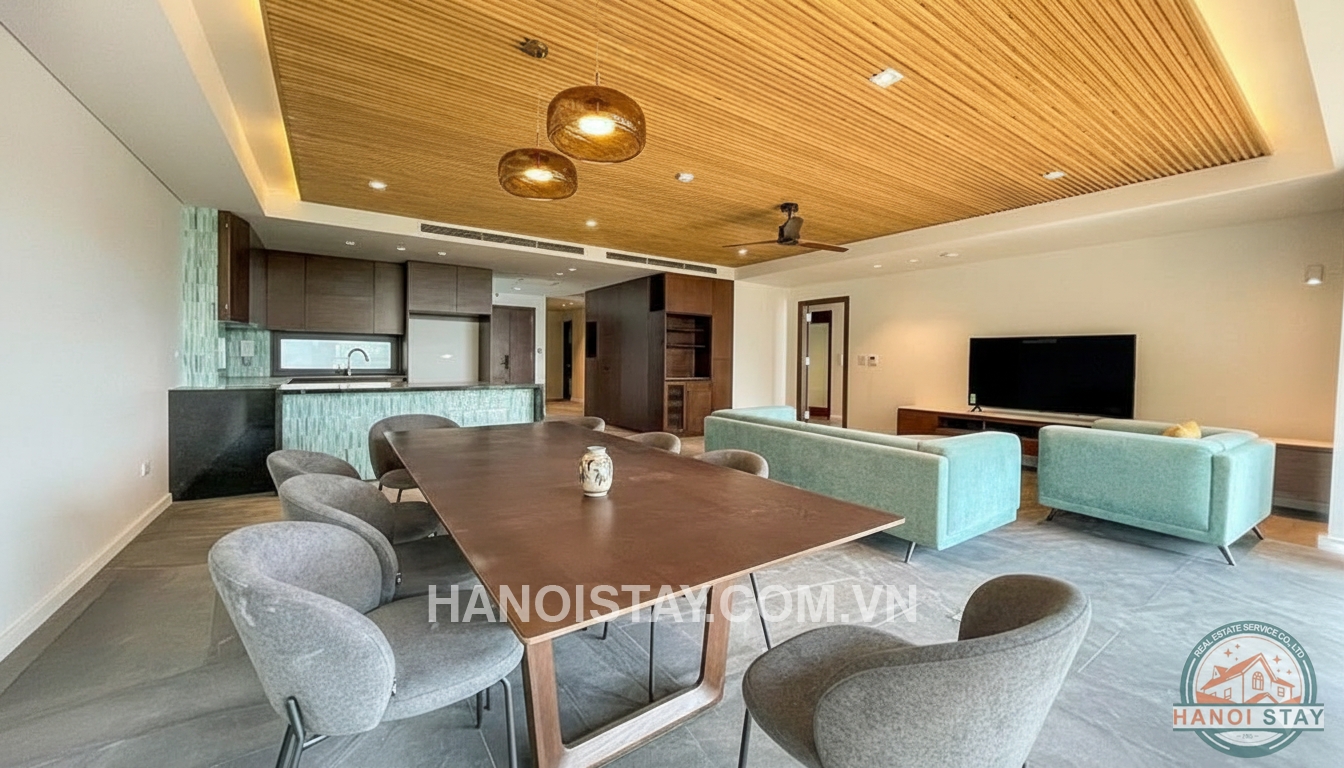 This modern 3 bedroom apartment with beautiful lake view for rent in Tay Ho offers a spacious open‑plan living and dining area, designed with a contemporary minimalist style and high‑quality finishes. A large wooden dining table with upholstered chairs connects seamlessly to the sleek kitchen, which features dark cabinetry, built‑in appliances and a stylish tile backsplash, creating a perfect space for both family meals and entertaining guests. The bright living room is furnished with pastel‑blue sofas, a low marble coffee table and a wall‑mounted TV cabinet, while the wooden slatted ceiling, ceiling fan and warm recessed lighting add a cozy yet luxurious touch.