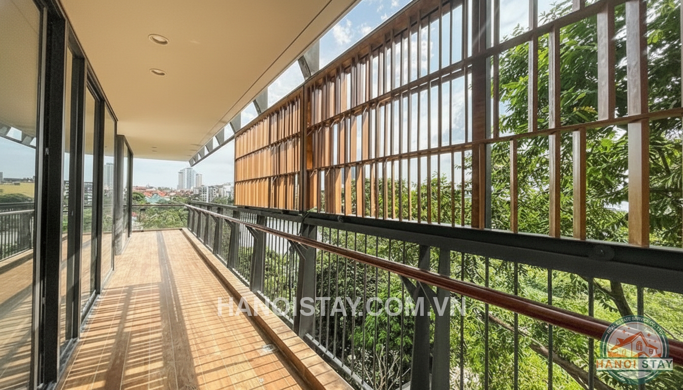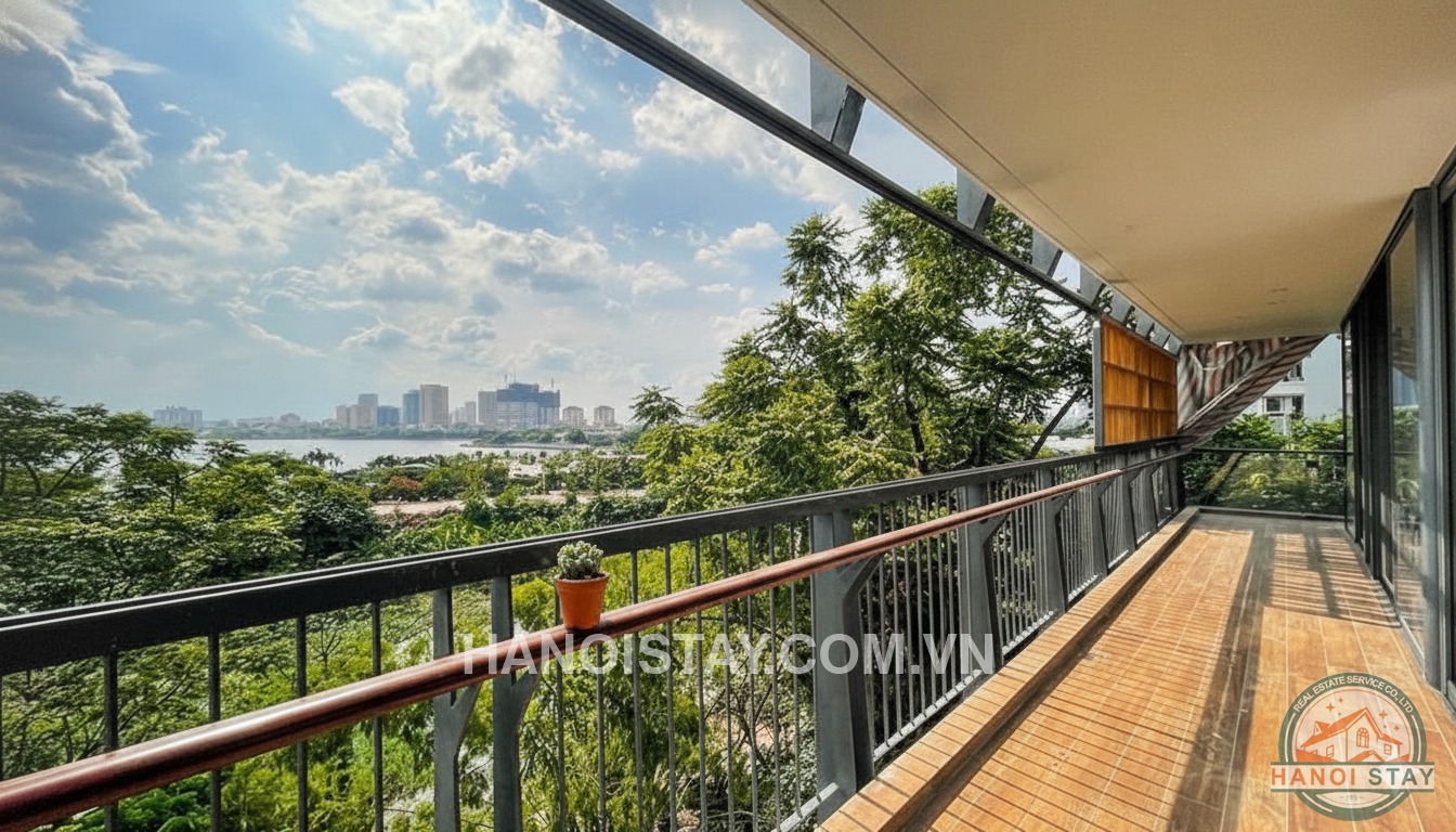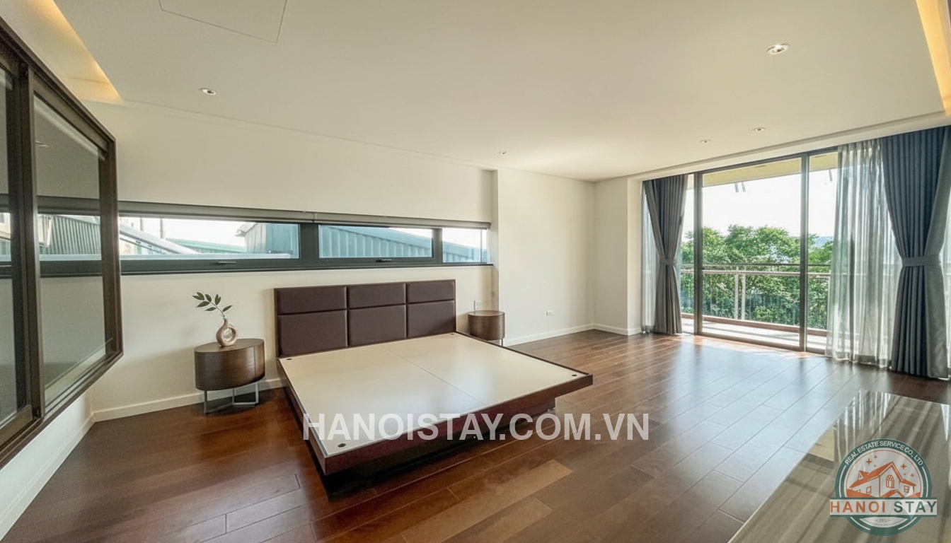 Floor‑to‑ceiling glass doors open from the living room onto an impressive wrap‑around balcony with wooden decking and metal railings, offering uninterrupted views of West Lake and lush greenery. The balcony runs along the facade, giving residents plenty of outdoor space for relaxing, placing plants or enjoying morning coffee and sunset breezes above Tay Ho’s peaceful streets. Inside, the master bedroom is generously sized, with wooden flooring, a modern platform bed and large sliding doors that also lead to the balcony, ensuring abundant natural light and a direct lake vista from the sleeping area.