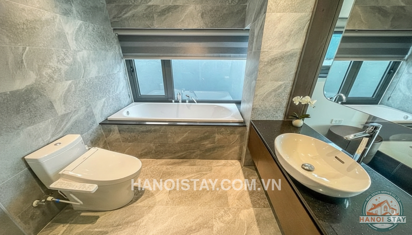 The bathrooms are finished to a high standard with stone‑effect tiles, a sleek vanity with vessel sink, a large mirror and a bathtub set below a wide window, bringing in soft daylight while maintaining privacy. Neutral colors, clean lines and premium materials are used throughout the apartment, creating a calm, sophisticated atmosphere that suits both families and professionals. This modern 3 bedroom apartment with beautiful lake view for rent in Tay Ho is ideal for anyone seeking a stylish, comfortable home with expansive outdoor space and one of the best lake views in Hanoi’s most sought‑after district.