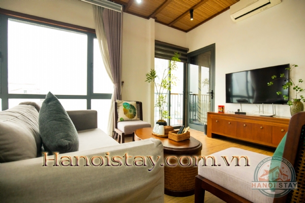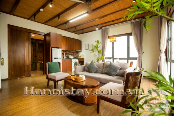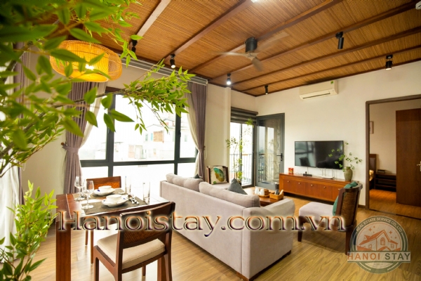 The apartment's aesthetic is defined by rich natural wood accents and a stunning, textural bamboo-mat ceiling, creating an immediate sense of warmth and sophisticated character.