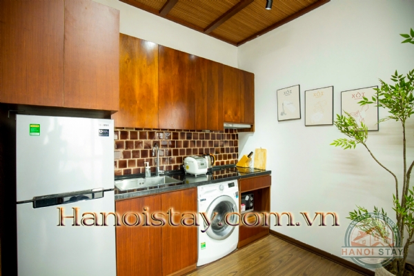 The Kitchen is both stylish and practical. Sleek oak cabinetry and a handsome tiled backsplash house a full suite of essential appliances, including a large refrigerator, induction stove, and microwave. For ultimate convenience, a washing machine is neatly integrated into the cabinetry.