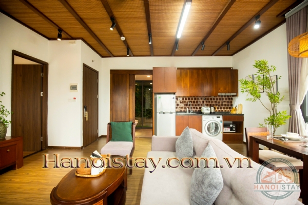The Living Area is a perfect space to relax, featuring a plush, comfortable sofa, custom-designed wood and wicker chairs, and an elegant coffee table. A large, flat-screen TV and high-speed Wi-Fi ensure you stay connected and entertained.