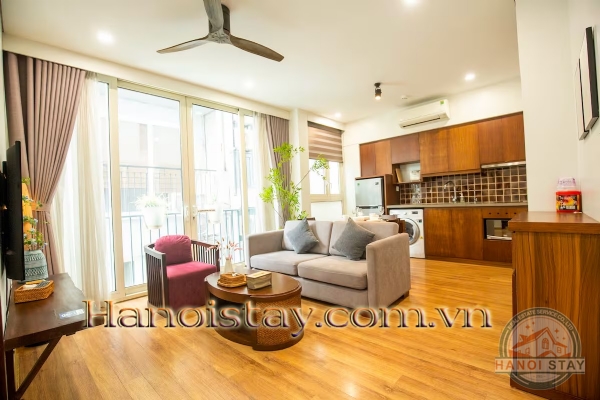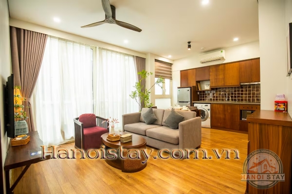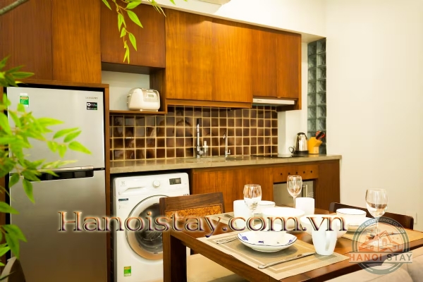 Gourmet Kitchen & Dining: The open-plan design flows seamlessly into your practical and stylish kitchen. Prepare meals in the fully equipped kitchen featuring elegant warm wood cabinetry, sleek dark countertops, and a subway-tile backsplash. It comes complete with a full-sized refrigerator, built-in cooktop, microwave, and a convenient in-unit washing machine. A stylish wood dining set provides a lovely spot to share meals.
