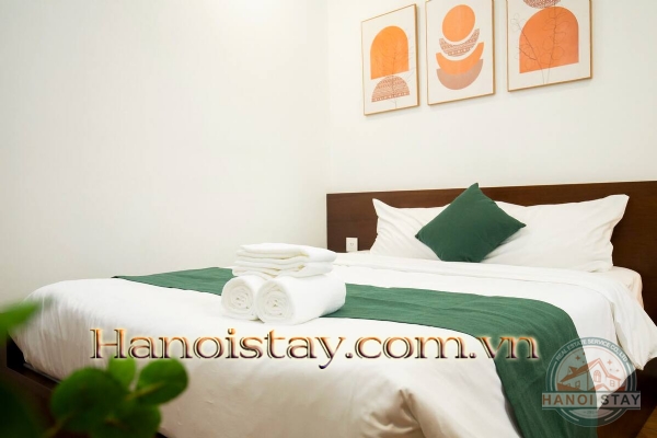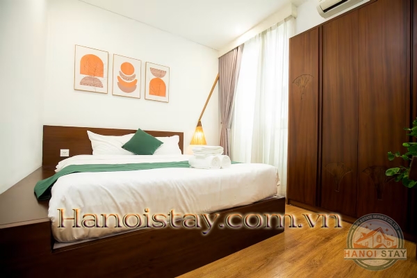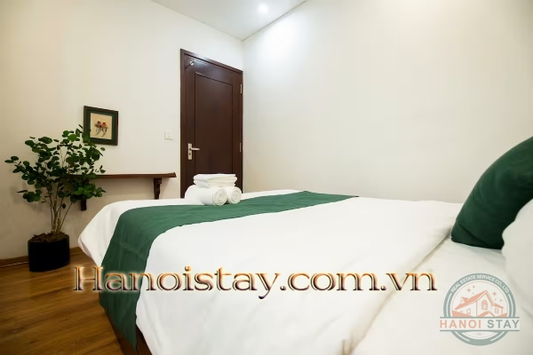Both bedrooms offer a restful, uncluttered escape. You’ll find comfortable beds dressed in crisp, hotel-quality white linens accented by vibrant pops of deep emerald green decor. They feature ample dark wood wardrobes for storage and are beautifully finished with sophisticated, minimalist wall art, creating a tranquil sanctuary.