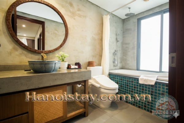 Rustic Spa Bath: Indulge in a truly relaxing soak in the bathtub, which is beautifully framed by handsome teal/dark green mosaic tiles. The space is completed with a rustic-chic vanity, a round ornate mirror, and a sophisticated stone basin sink.