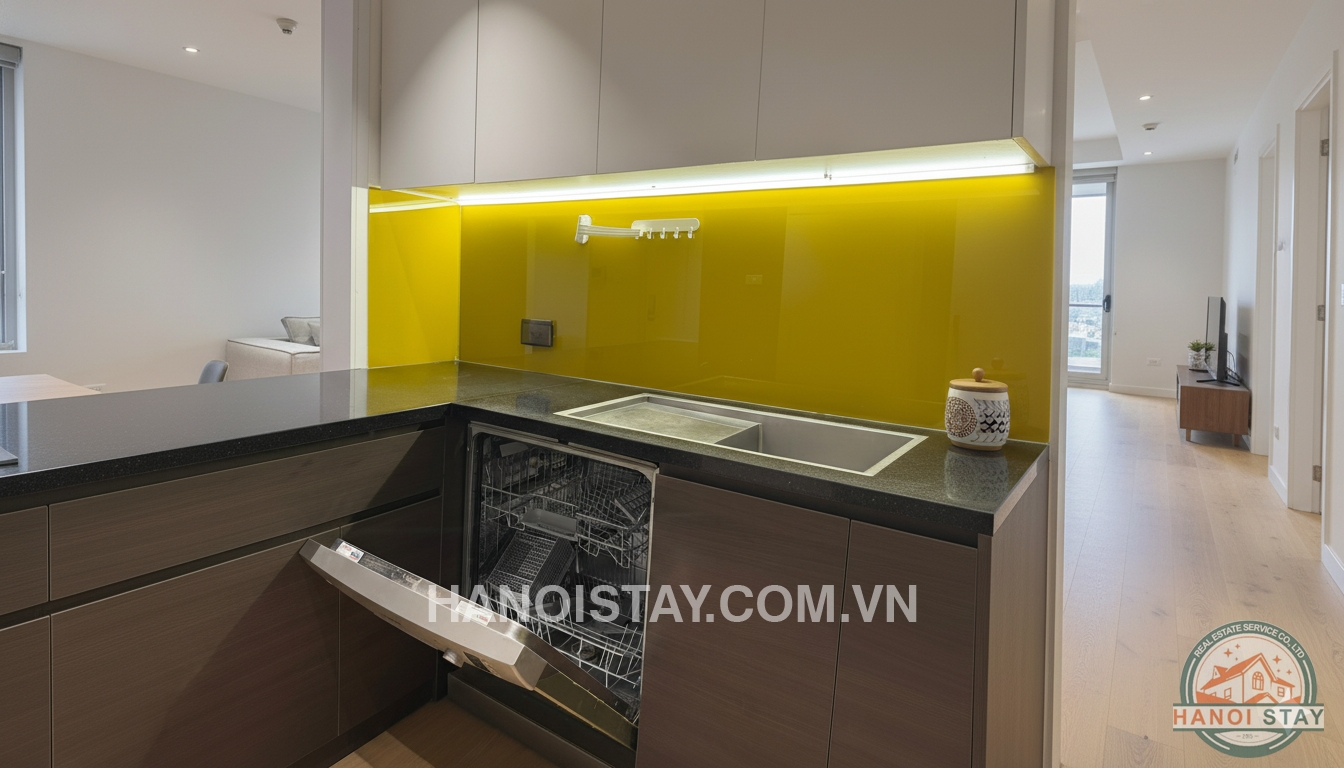 🍽️ Kitchen: Fully equipped with oven, microwave, built-in dishwasher, and a striking lime-yellow backsplash with a sleek mirror fridge.