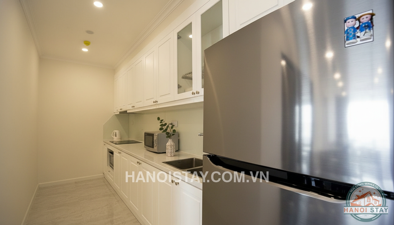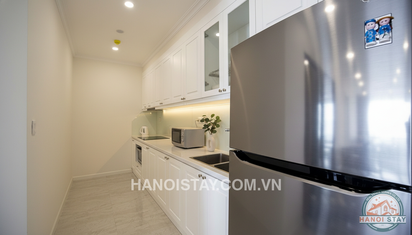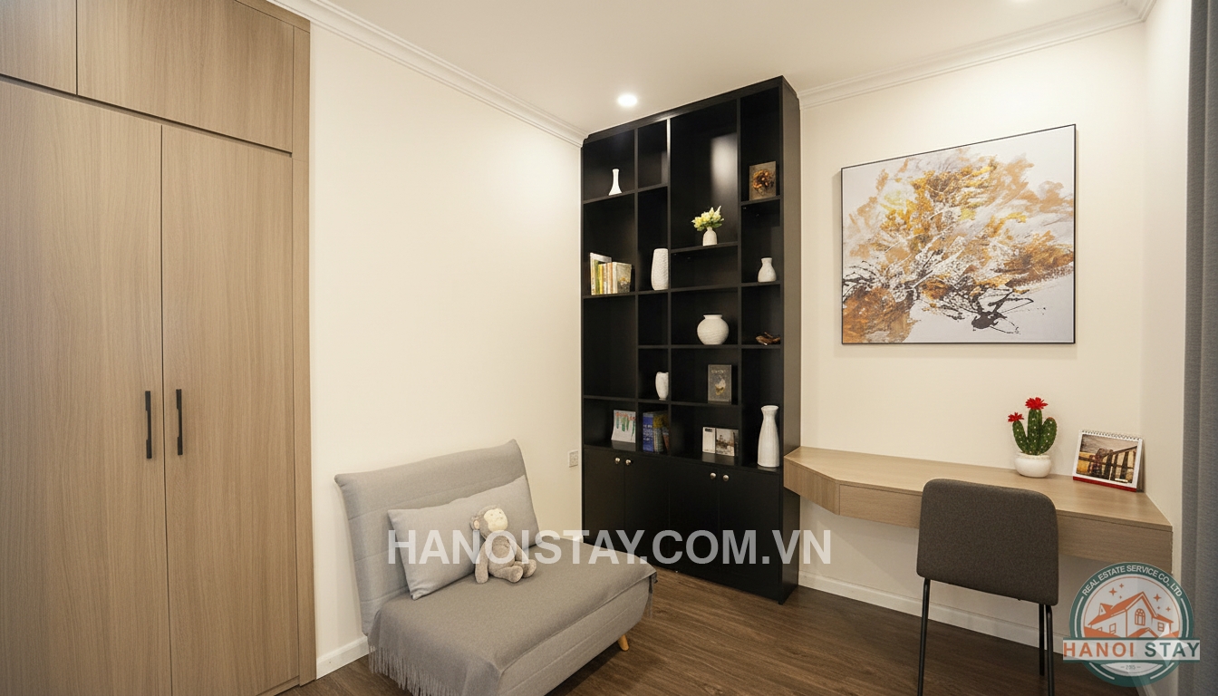 Fully equipped: High-end furniture and appliances included – built-in kitchen cabinets, wardrobes, work desk, and electronics (TV, Samsung washing machine, refrigerator, etc.).