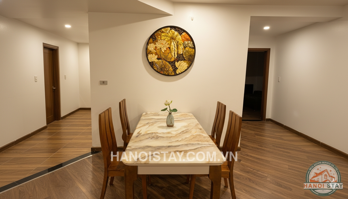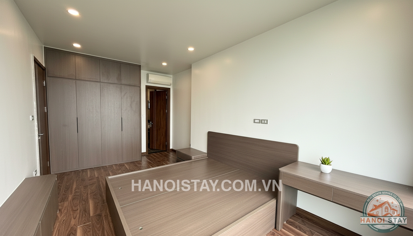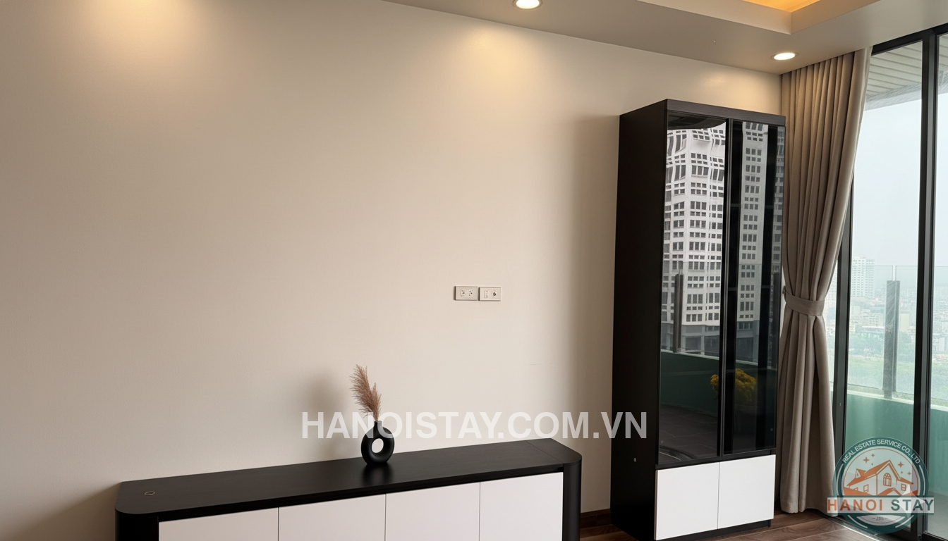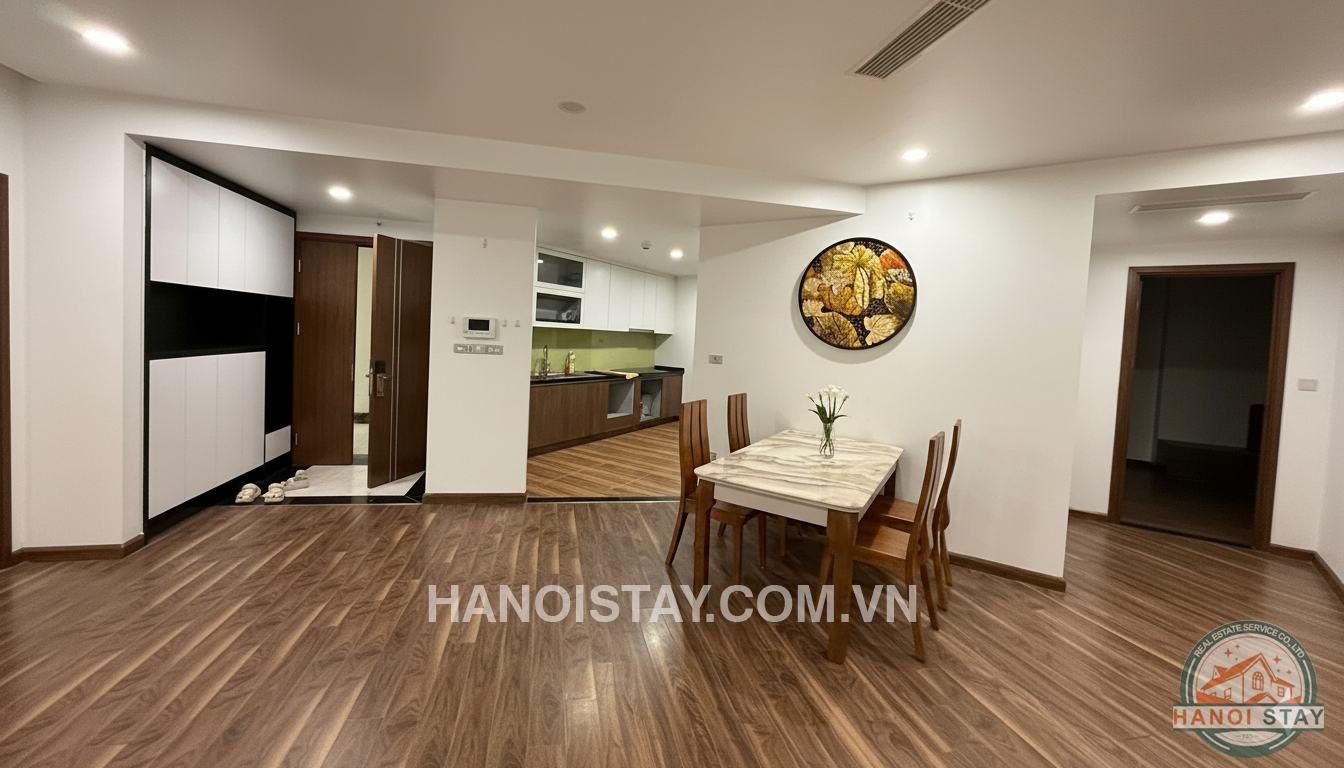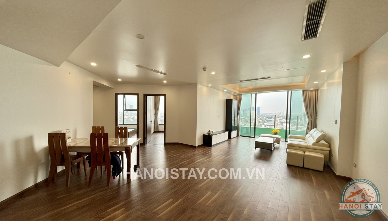 Welcome to this spacious three-bedroom (3BR) apartment, spanning 140m2, located in the prestigious Diplomatic Corps Compound (Ngoại Giao Đoàn). The apartment boasts a modern, minimalist design with a harmonious blend of white, black, and warm wooden tones, ensuring a bright, airy, and comfortable living space.