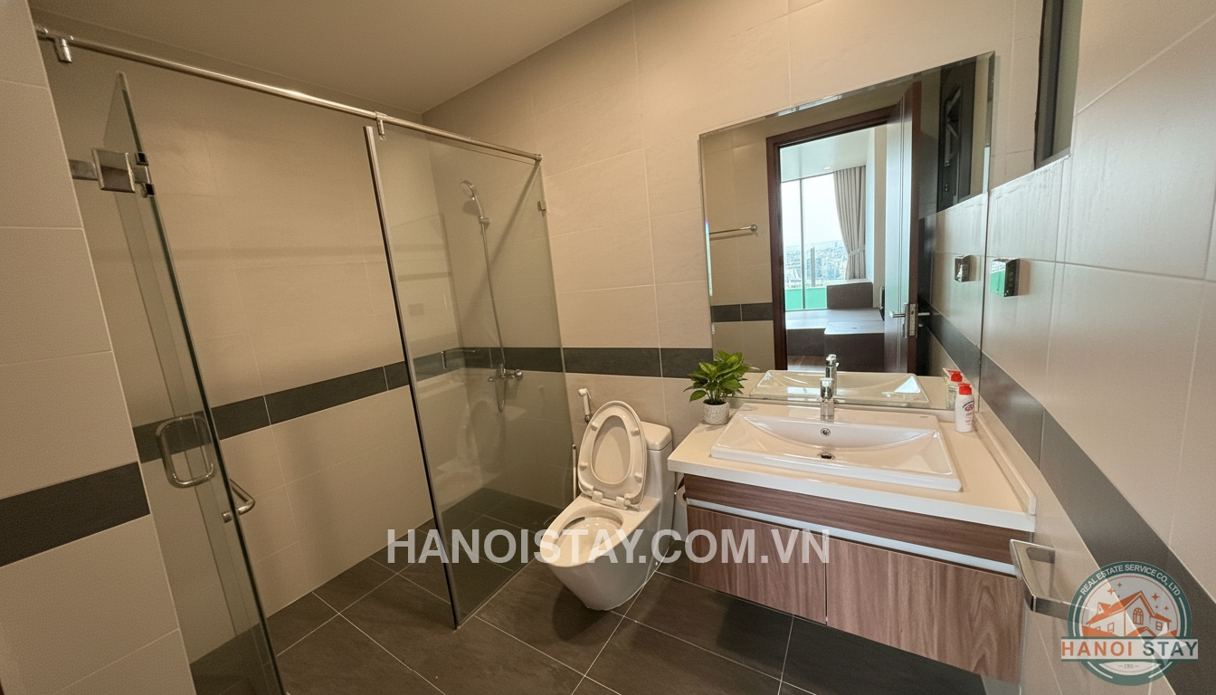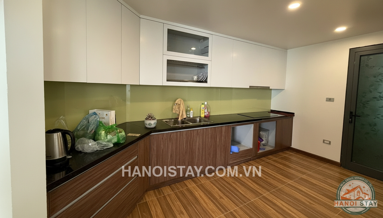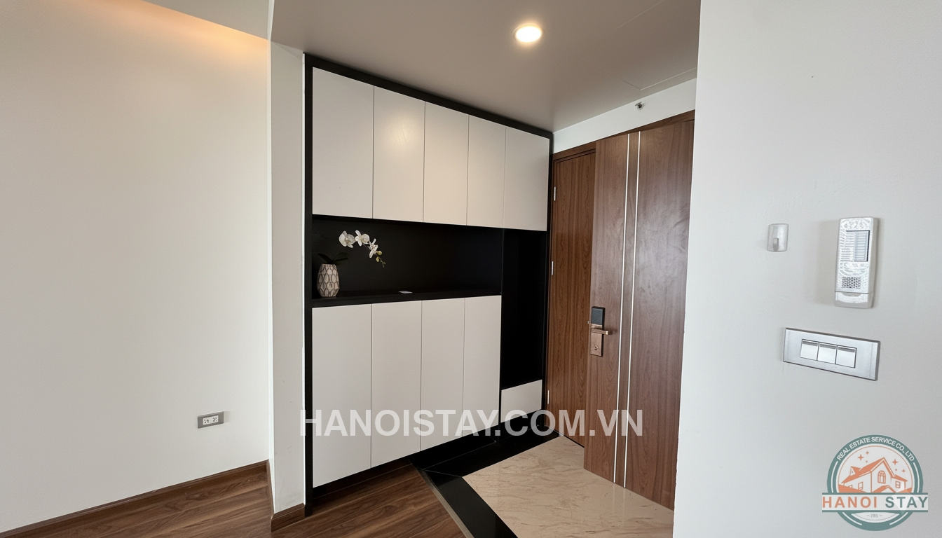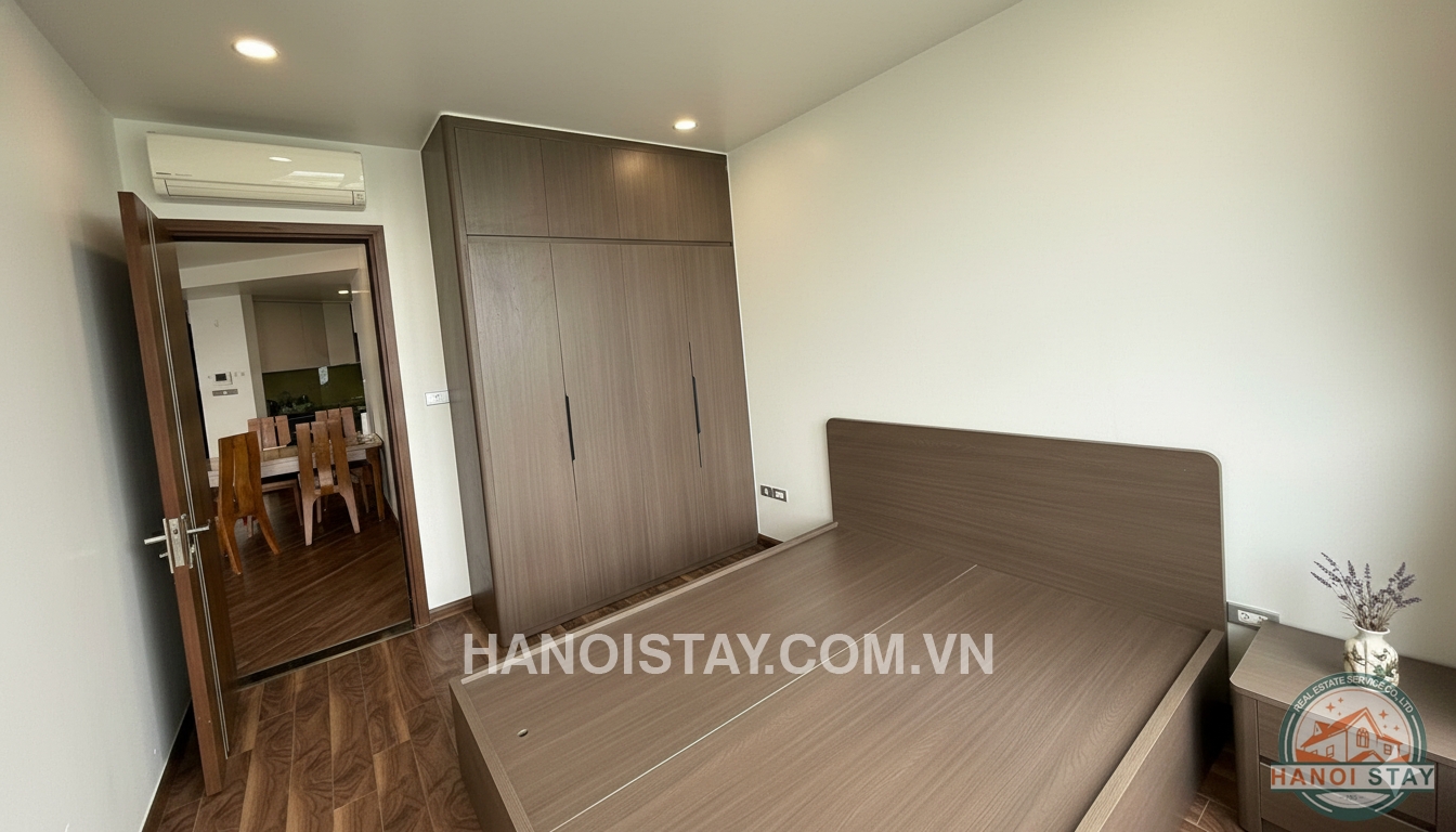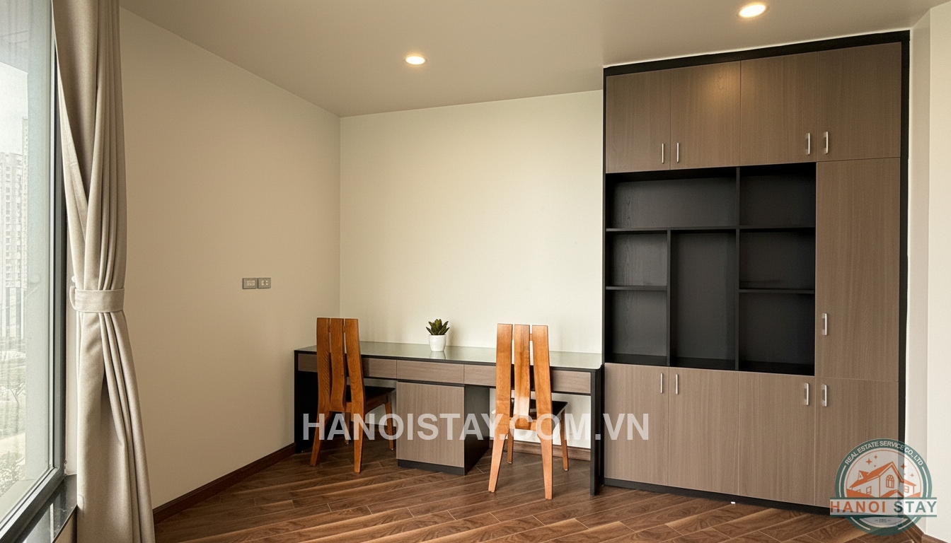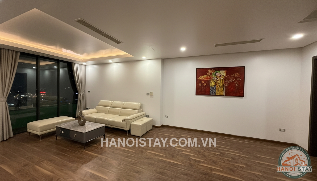 Welcome to this spacious three-bedroom (3BR) apartment, spanning 140m2, located in the prestigious Diplomatic Corps Compound (Ngoại Giao Đoàn). The apartment boasts a modern, minimalist design with a harmonious blend of white, black, and warm wooden tones, ensuring a bright, airy, and comfortable living space.