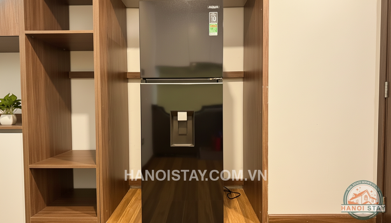 Major Appliances: Includes a modern Aqua refrigerator (black glossy finish) and air conditioners in all main rooms.