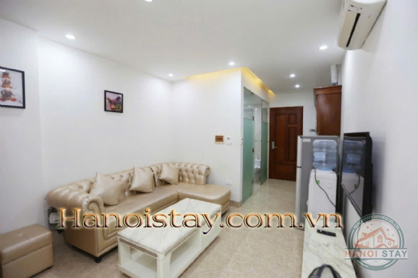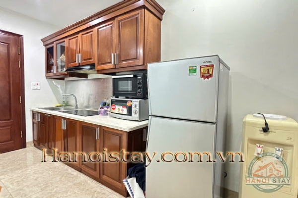 Fully Equipped: The kitchen is compact yet functional, complete with necessary appliances (wooden cabinets, refrigerator, microwave). The bathroom features a convenient glass-enclosed shower cabin.