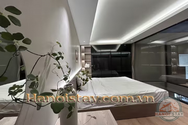 • Luxury Bedroom: Features a large, comfortable bed base, and a striking dark/smoked glass closet system that adds depth and a dramatic focal point.