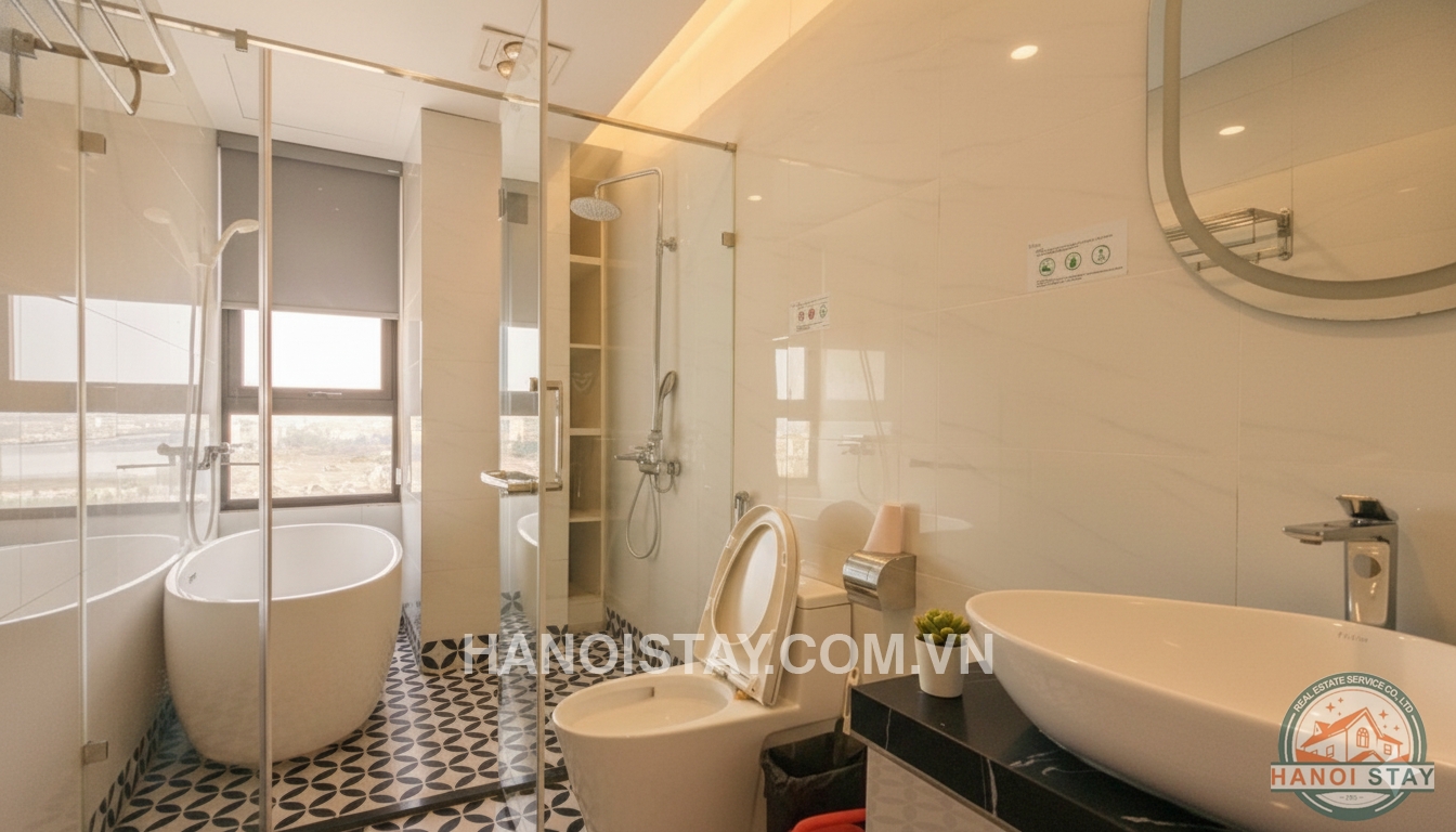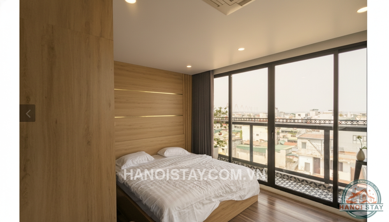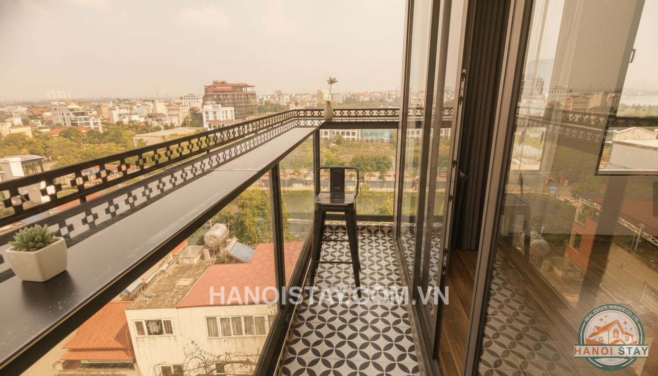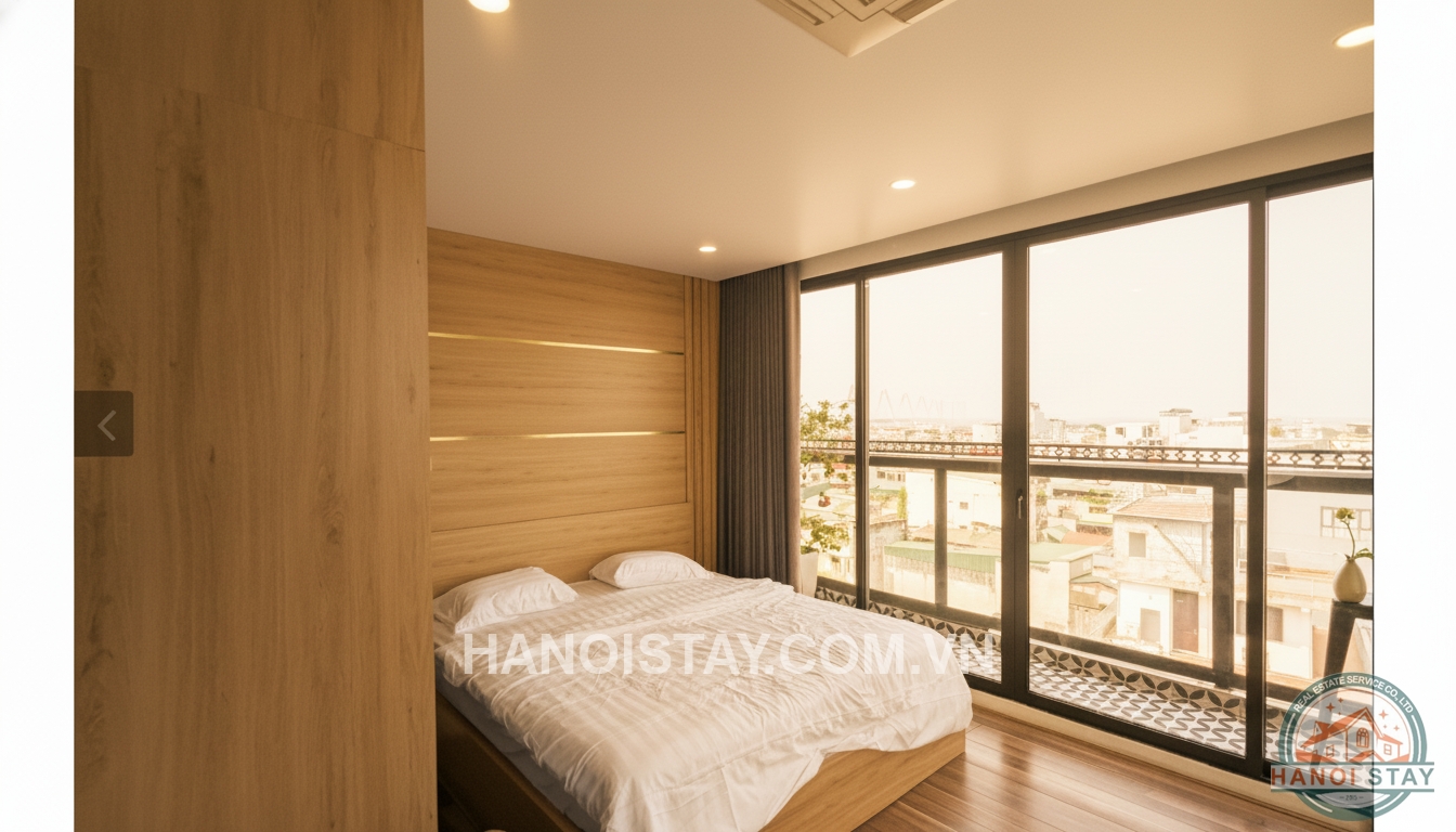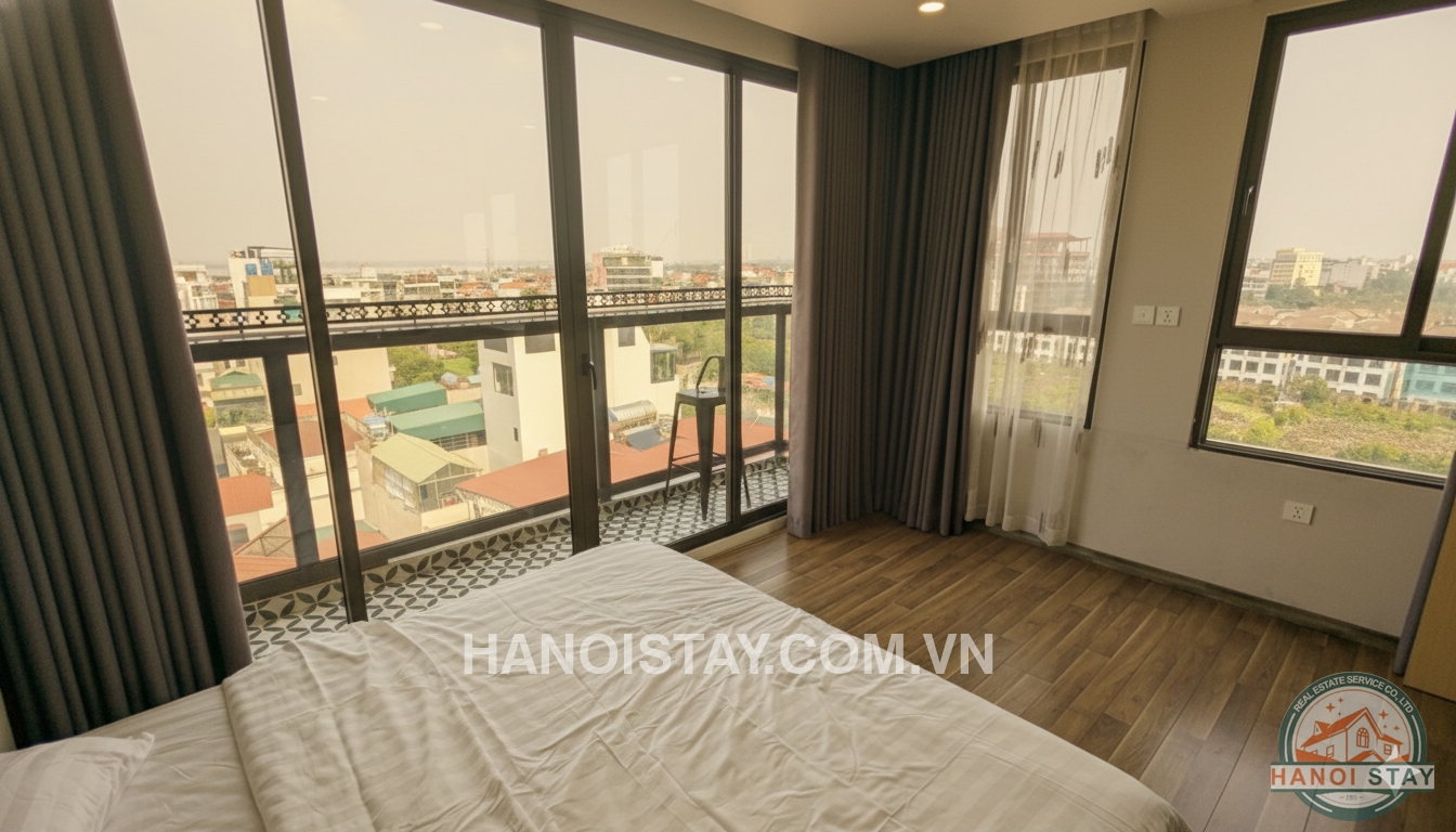 The bedroom is an ideal retreat with a large double bed and a high-end wooden headboard design. The most special feature is the large glass window system leading to the balcony, opening up to a spectacular view of West Lake and the romantic Ferris Wheel. The balcony is laid with classic pattern tiles and features a high bar table, perfect for enjoying coffee or relaxing while admiring the city skyline.
