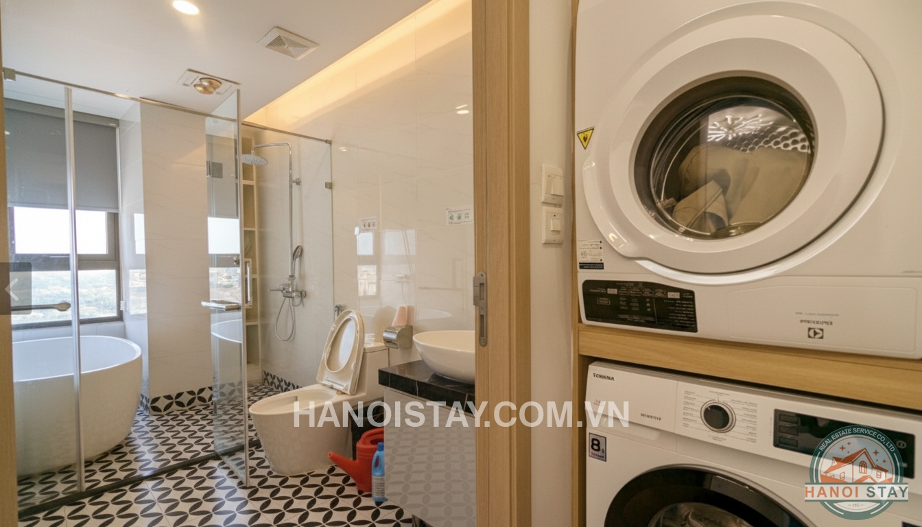 The bathroom is spacious and clean, featuring a separate wet/dry area with a glass partition, and is equipped with a modern shower and a relaxing bathtub. The apartment also includes modern amenities such as a stacked washing machine and dryer, ensuring the most convenient lifestyle.