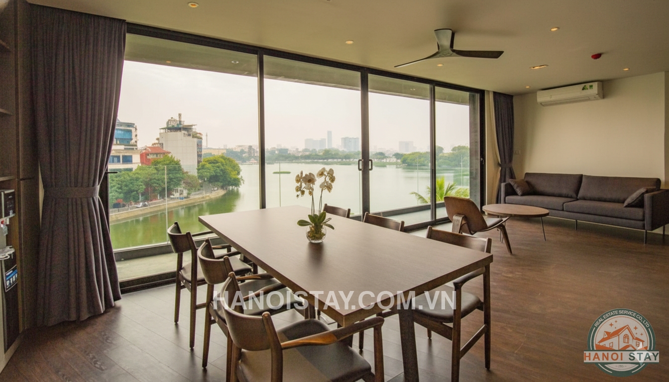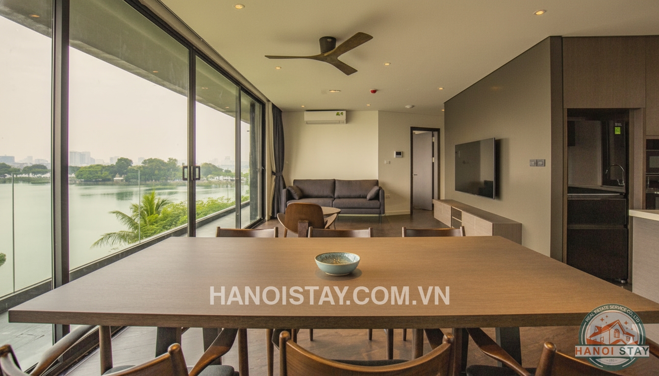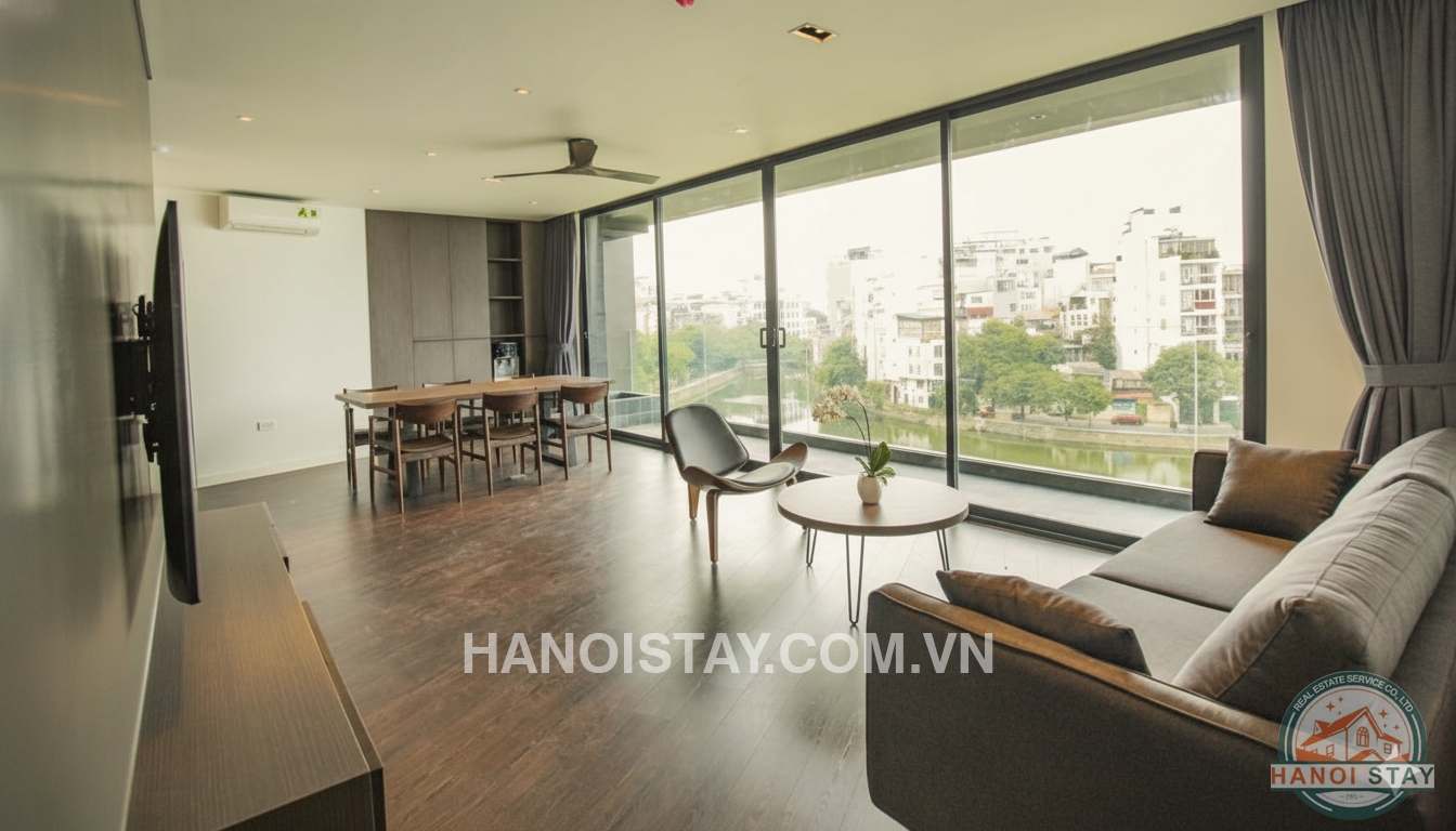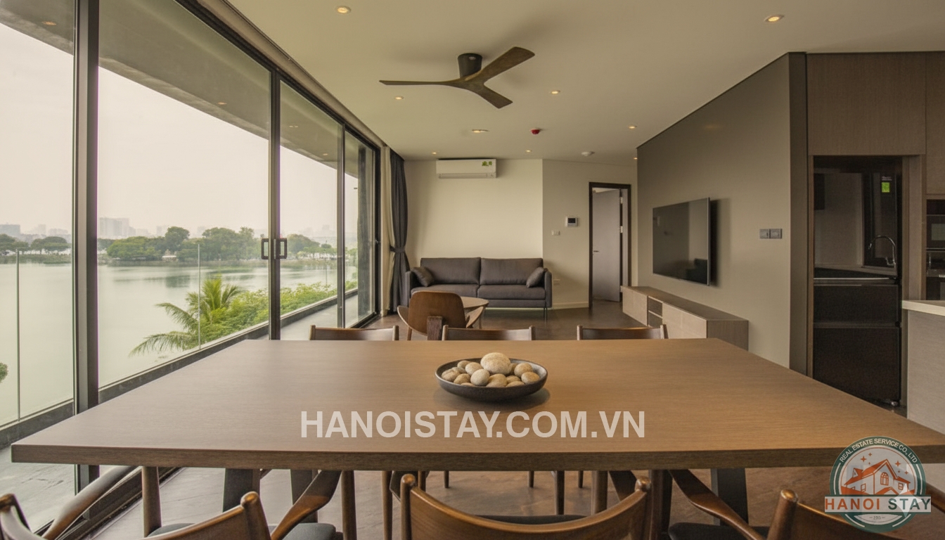 Lake view 2 bedroom apartment for rent in Truc Bach, Ba Dinh – a modern, fully furnished home with breathtaking lake views right from your living room. This stylish apartment features floor‑to‑ceiling glass walls that fill the space with natural light and create a relaxing atmosphere, perfect for unwinding after a busy day in Hanoi. The open‑plan living and dining area is fitted with high‑quality wooden flooring, a comfortable sofa, a large smart TV, and elegant furniture, so you can move in and enjoy your new home immediately.