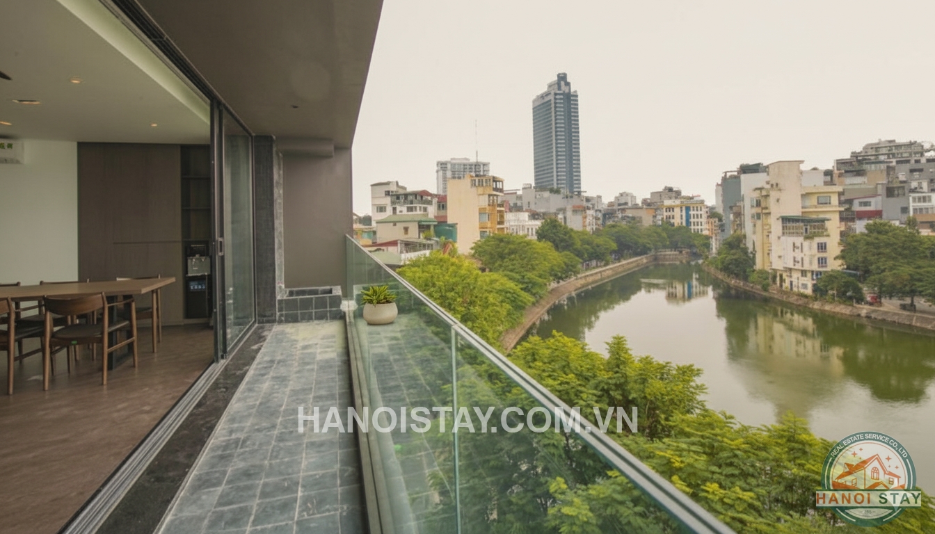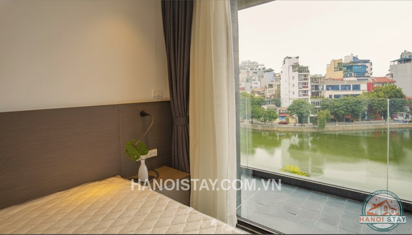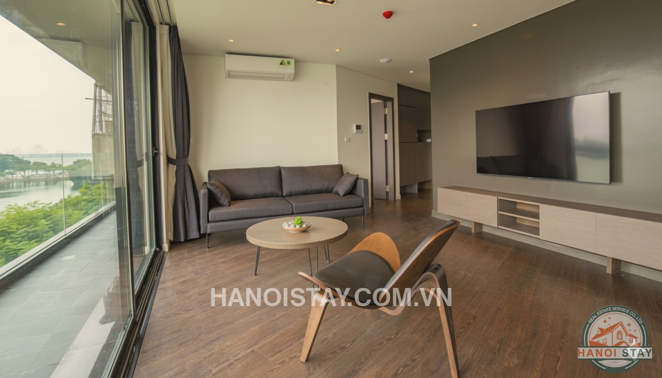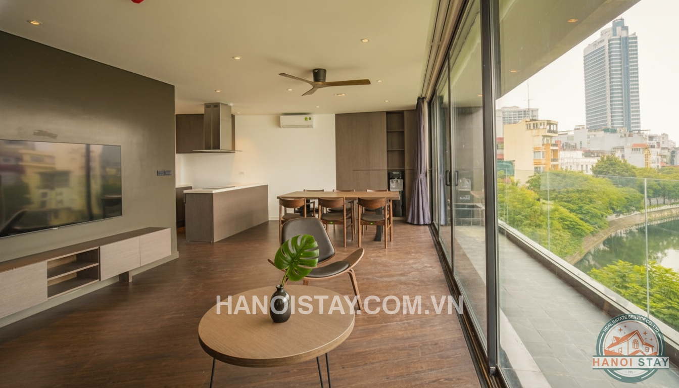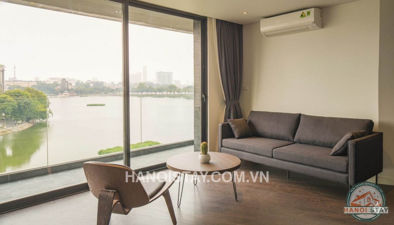 Lake view 2 bedroom apartment for rent in Truc Bach, Ba Dinh – a modern, fully furnished home with breathtaking lake views right from your living room. This stylish apartment features floor‑to‑ceiling glass walls that fill the space with natural light and create a relaxing atmosphere, perfect for unwinding after a busy day in Hanoi. The open‑plan living and dining area is fitted with high‑quality wooden flooring, a comfortable sofa, a large smart TV, and elegant furniture, so you can move in and enjoy your new home immediately.