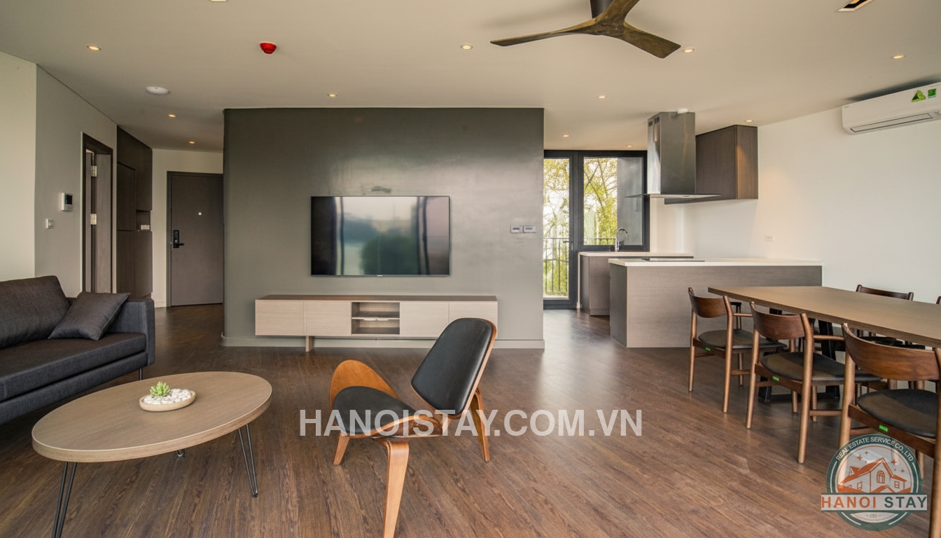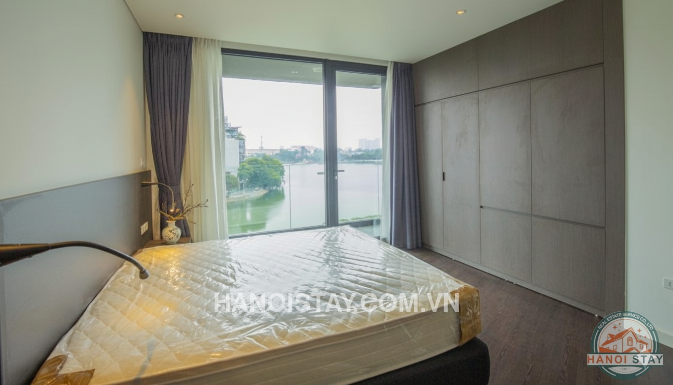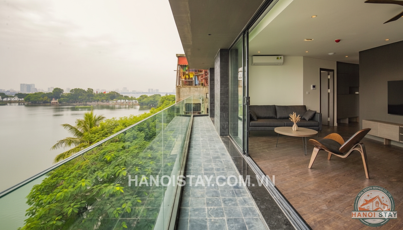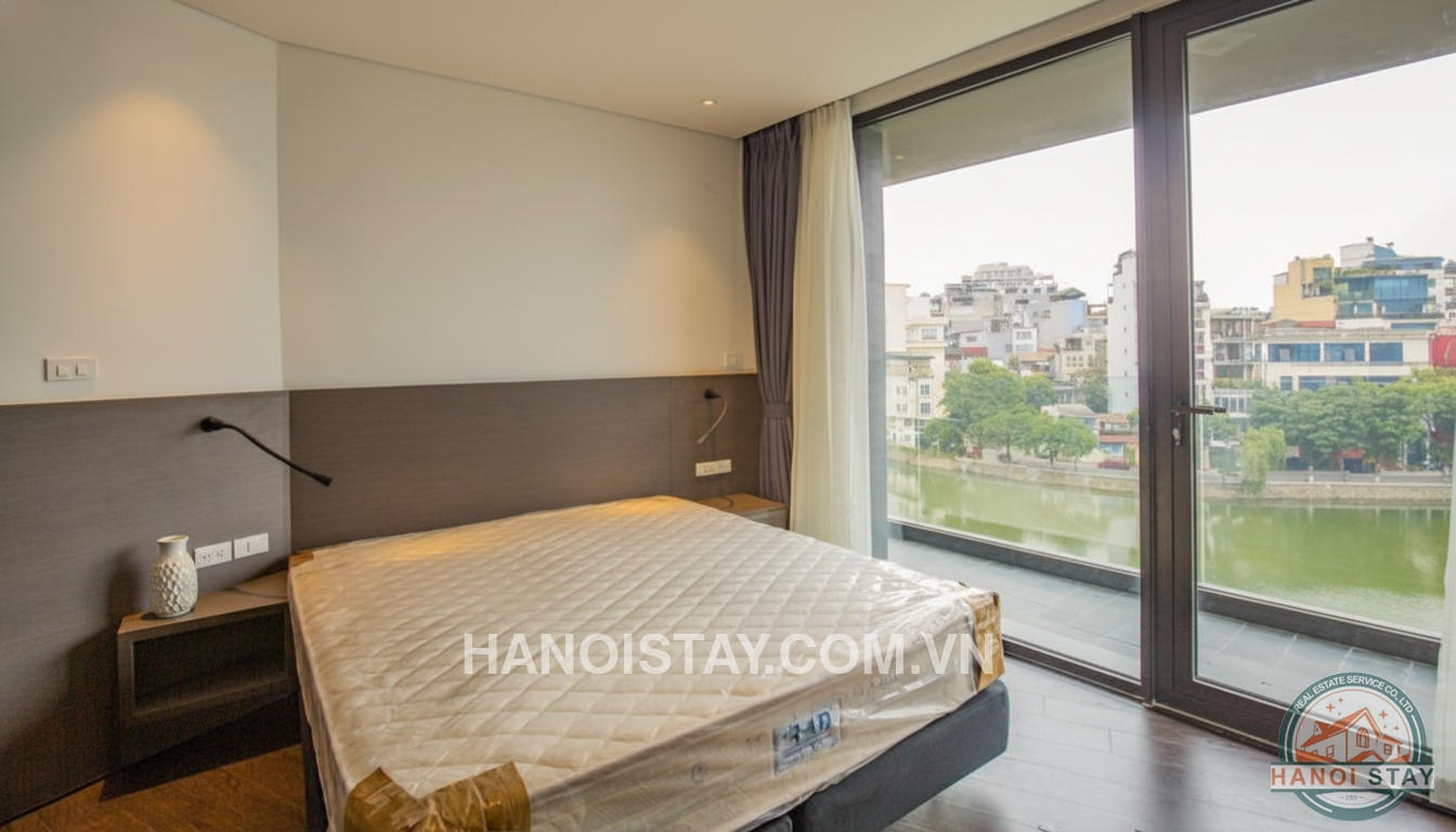 Lake view 2 bedroom apartment for rent in Truc Bach, Ba Dinh – a modern, fully furnished home with breathtaking lake views right from your living room. This stylish apartment features floor‑to‑ceiling glass walls that fill the space with natural light and create a relaxing atmosphere, perfect for unwinding after a busy day in Hanoi. The open‑plan living and dining area is fitted with high‑quality wooden flooring, a comfortable sofa, a large smart TV, and elegant furniture, so you can move in and enjoy your new home immediately.