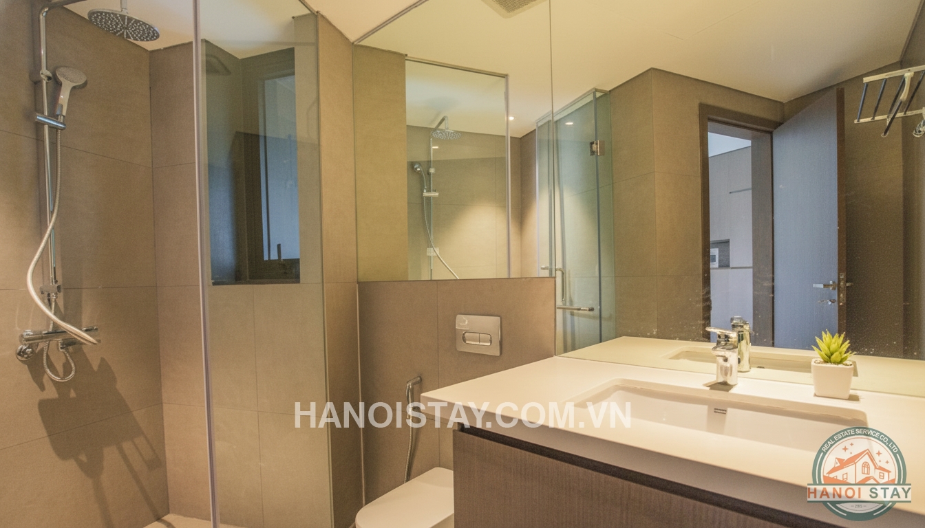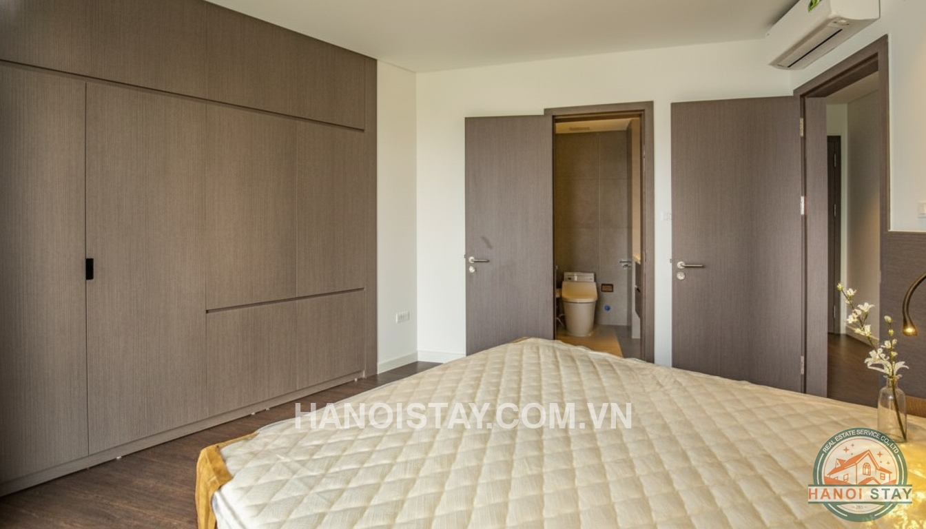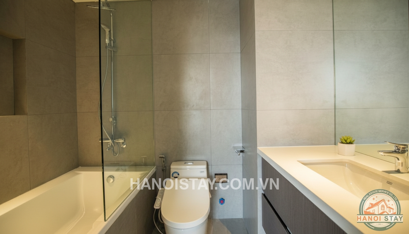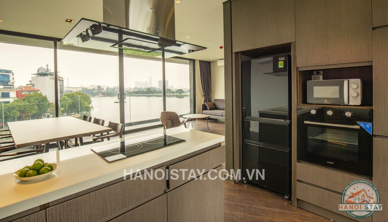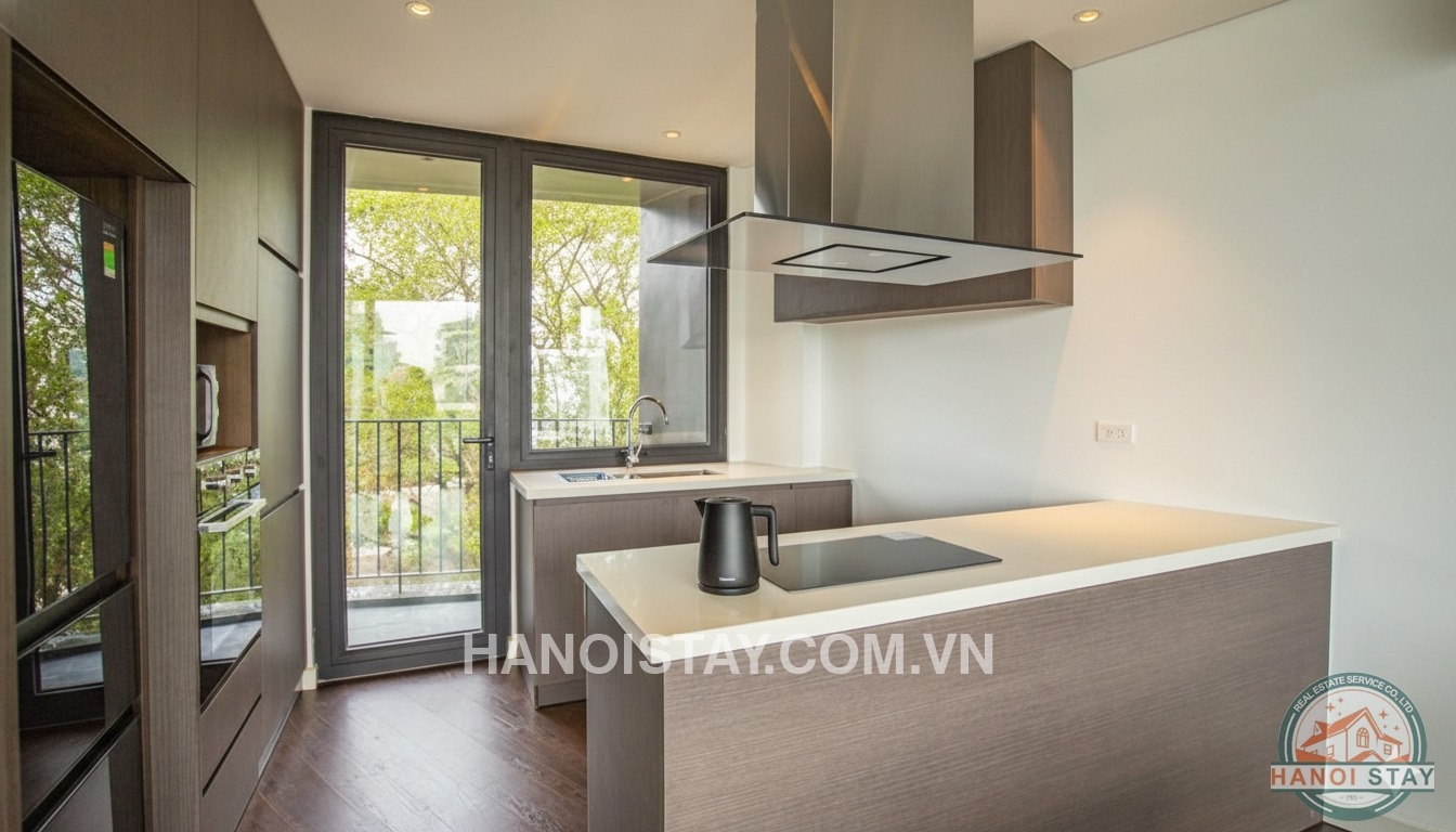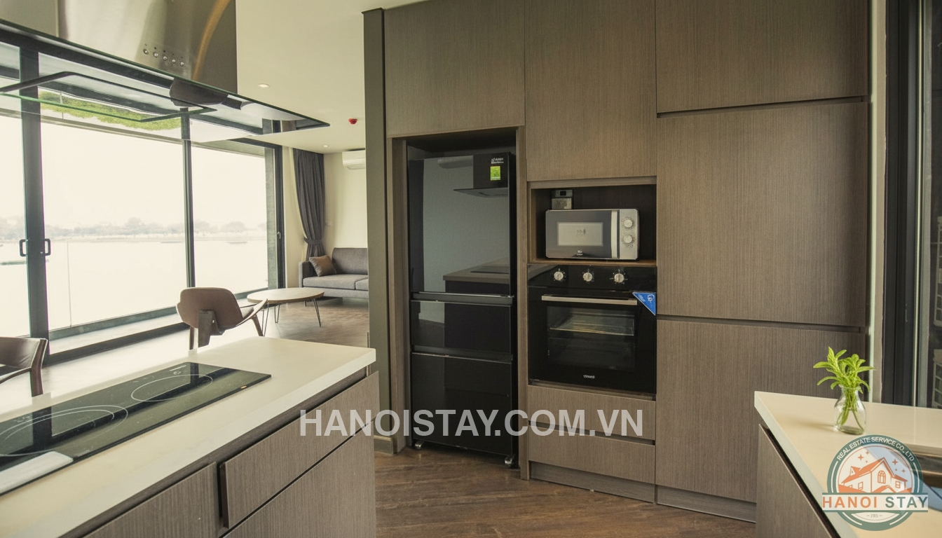 A modern kitchen is thoughtfully designed with an induction hob, built‑in oven, microwave, large refrigerator, and plenty of cabinets, making everyday cooking and hosting friends both convenient and enjoyable. Two cozy bedrooms come with good‑quality mattresses, large wardrobes, and direct views of Truc Bach Lake, giving you a quiet, private retreat in the heart of the city. The bathrooms are equipped with a bathtub, glass shower, and high‑end sanitary ware, providing a clean and comfortable space for your daily routine.
