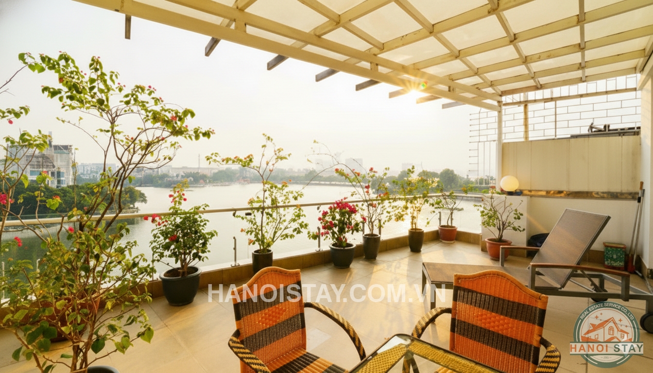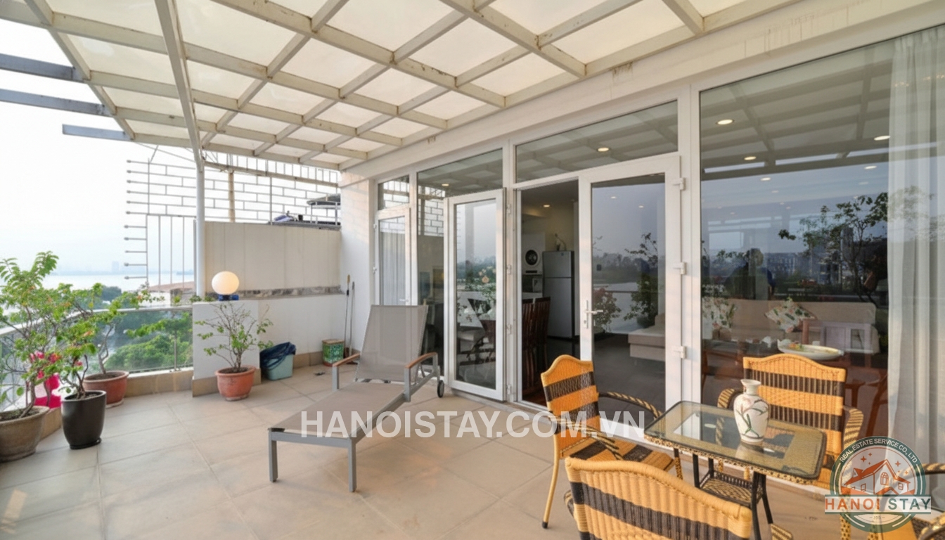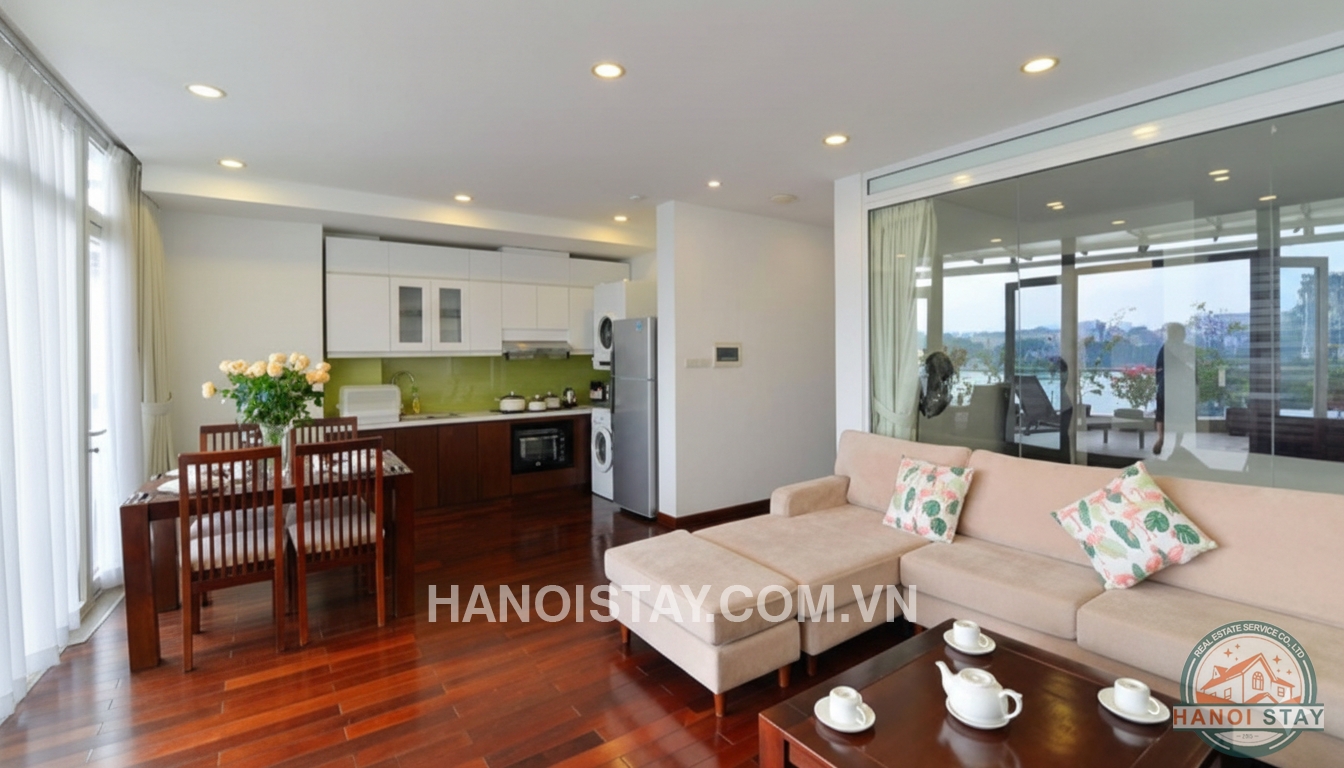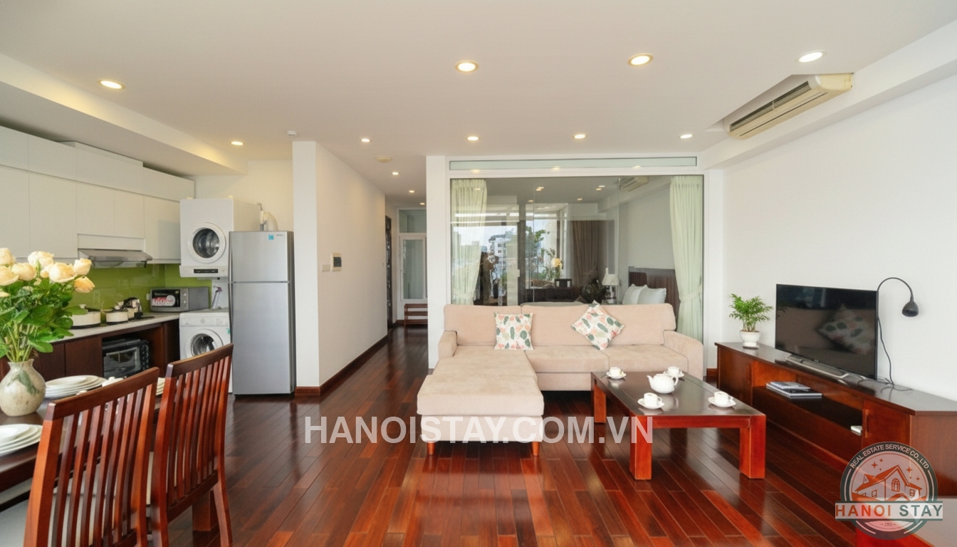 This amazing apartment owns a balcony stretching along the apartment with a balcony area of up to 20m2 overlooking Truc Bach Lake, good size living room, modern kitchen with stainless steel appliances, Qeen size Bed spacious storage with upper cabinet.
