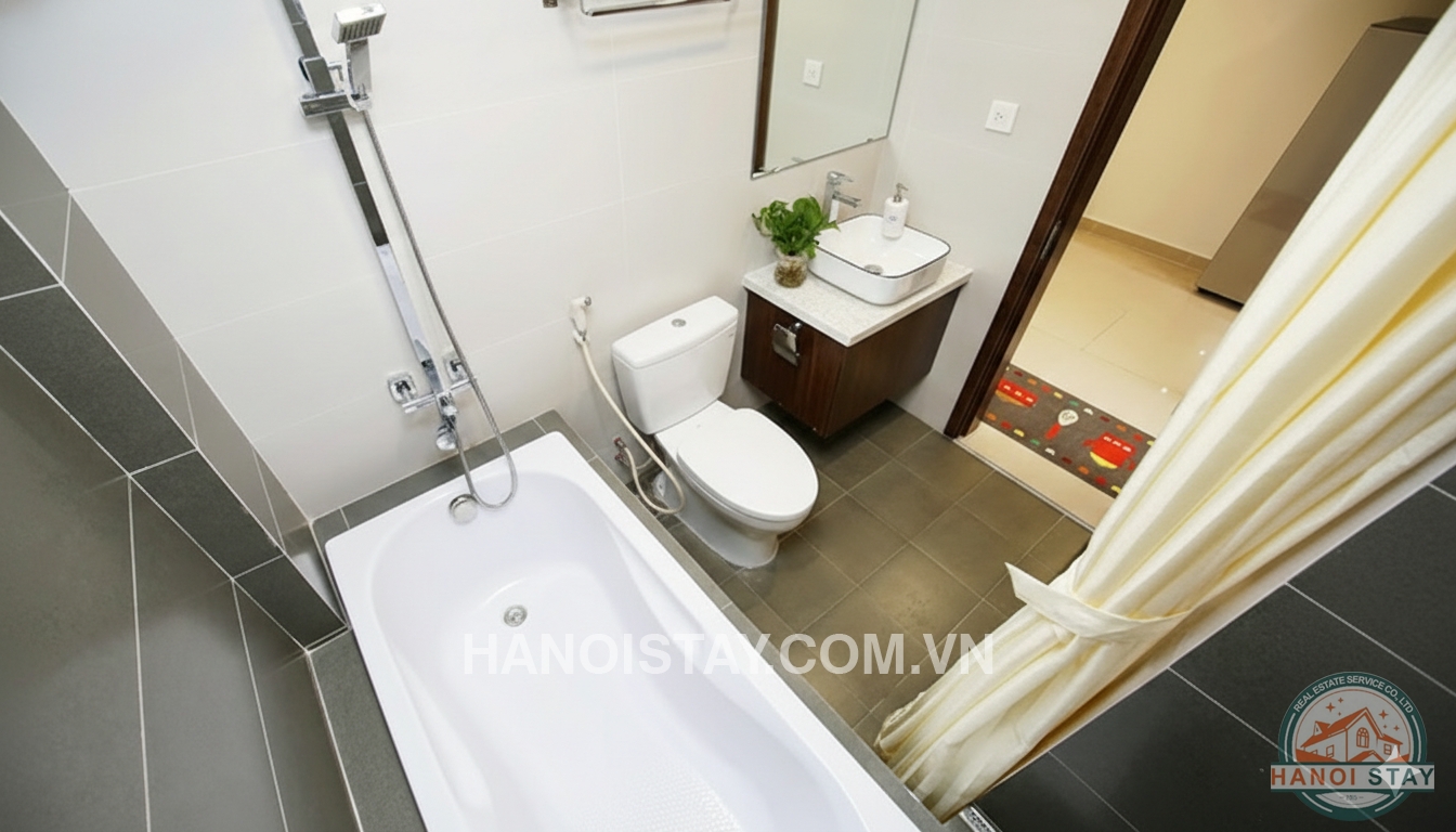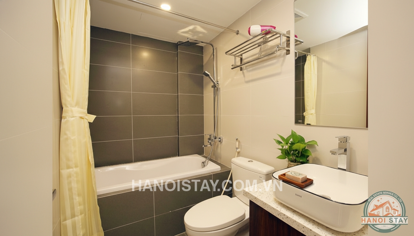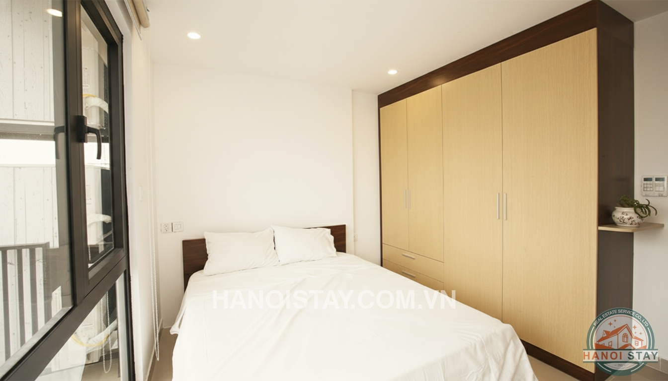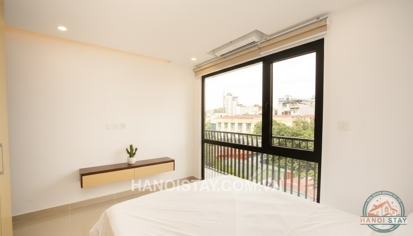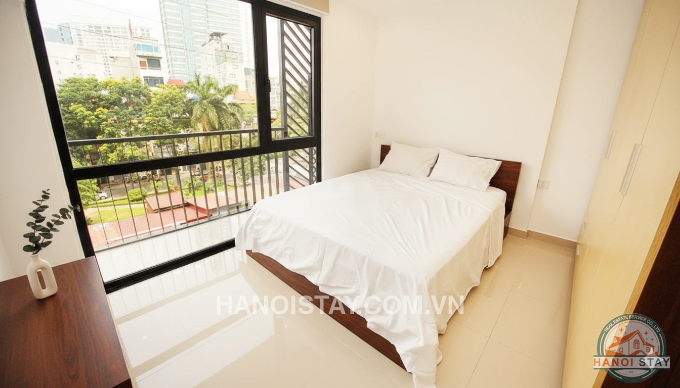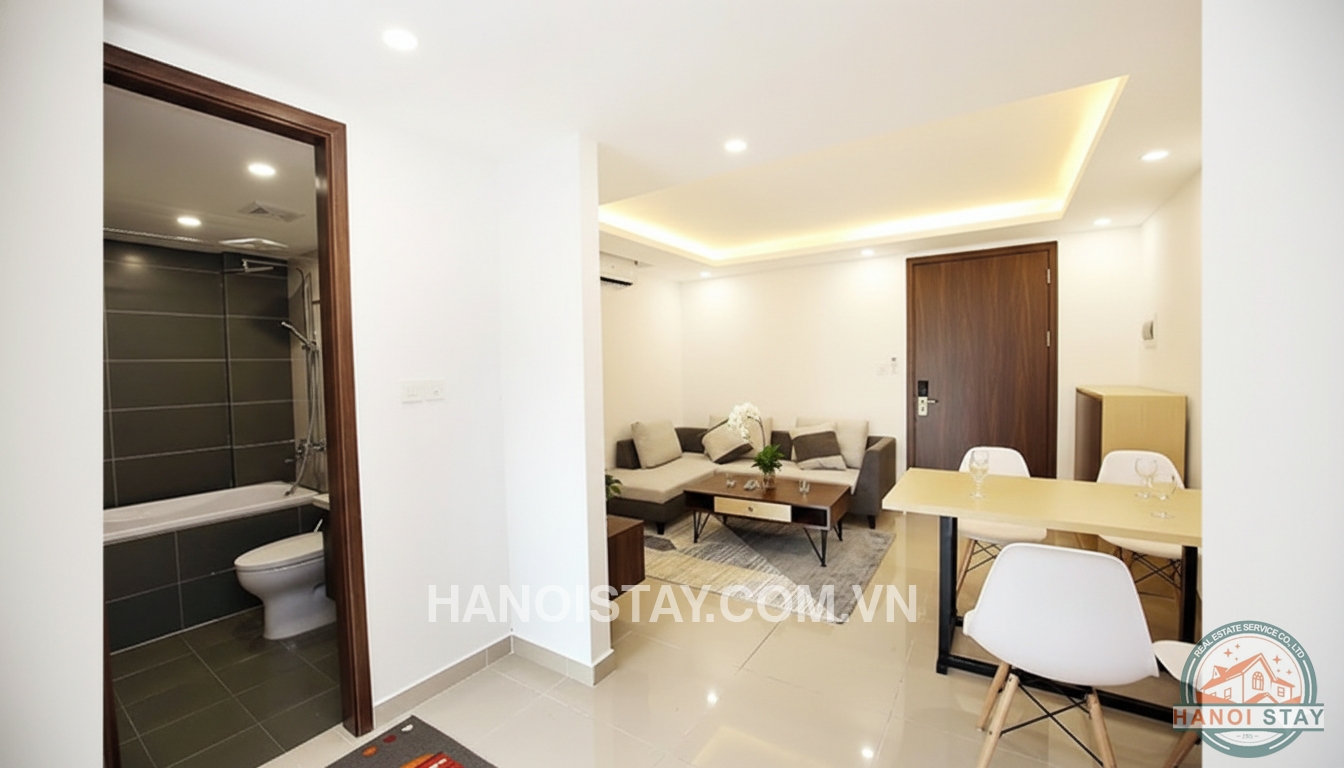 Brand new serviced apartment Rental in Truc Bach Area, High quality furnishings. With an usable area of 45 sqm, the flat includes cozy livingroom with L shape sofa, coffee table, LCD Tv, functional kichen with shiny kitchen cabinet,, big fridge, microwave, stainless steel cooking utensil. The bright bedroom with Queen size bed, white coler bed stuff combined with small lovely balcony, a huge wardrobe with lots of drawers. The standard bathroom with bathtub shower...